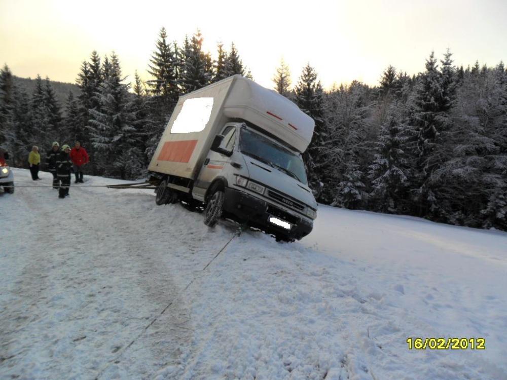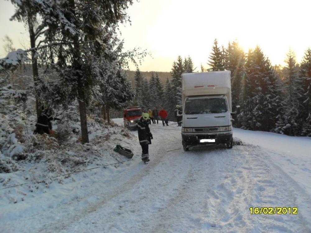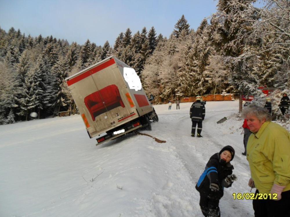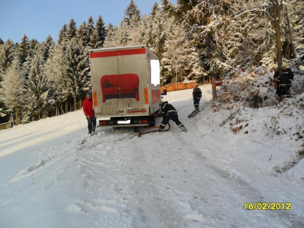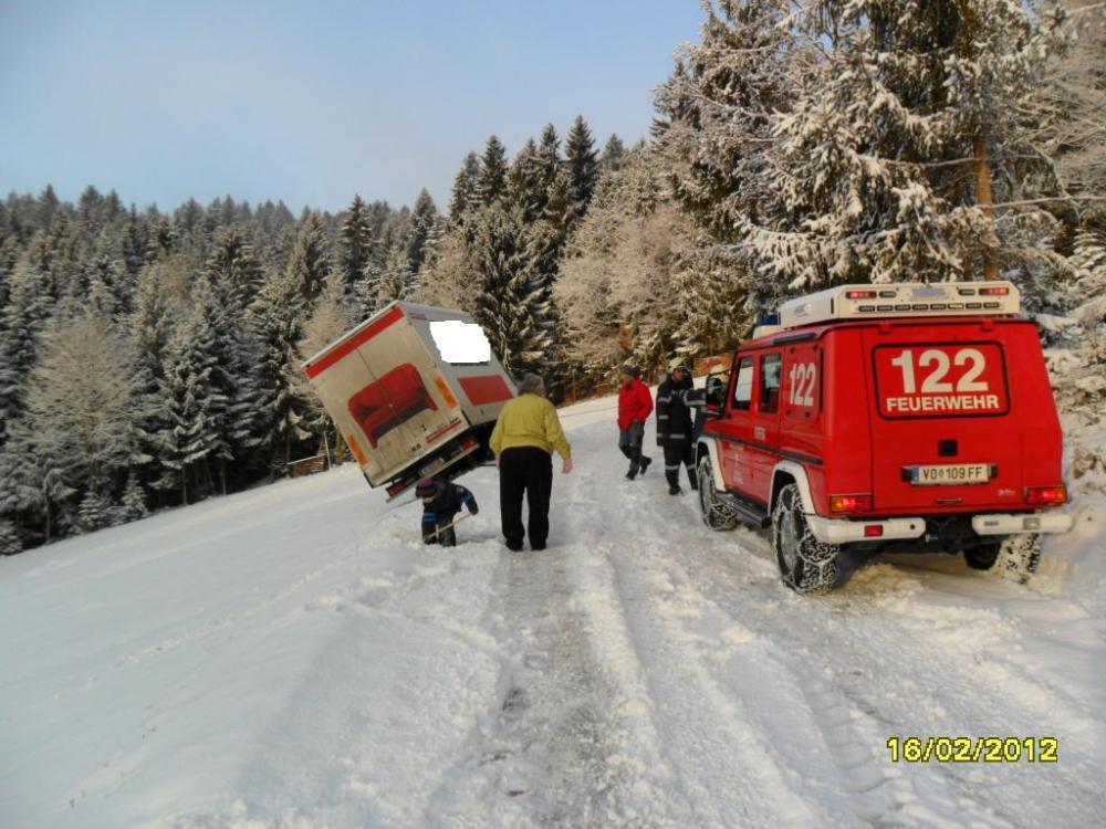 VOITSBERG, am 16.02.2012 Auf einer Schneefahrbahn kam ein Klein-LKW von der Straße ab, rutschte über eine Böschung und drohte umzustürzen. Die FF Voitsberg sicherte das Fahrzeug und barg es sodann mit den Seilwinden des RLFA-Tunnel und des KRFB. Zusätzlich wurde das Fahrzeug bei einem Baum gesichert. Nach der Bergung konnte der Klein-LKW seine Fahrt auf eigener Achse fortsetzen.
