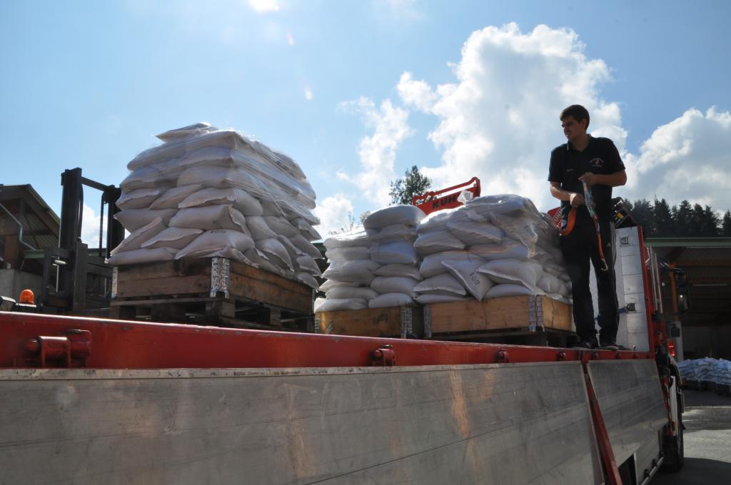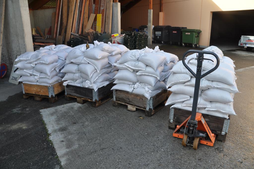 Ein Teil der Paletten mit den gefüllten Sandsäcken wurde mit dem WLF Voitsberg zum Bezirksstützpunkt FF Hallersdorf überstellt, einige Paletten werden bei der FF Afling gelagert und der Rest wird auf die Feuerwehrstandorte aufgeteilt.