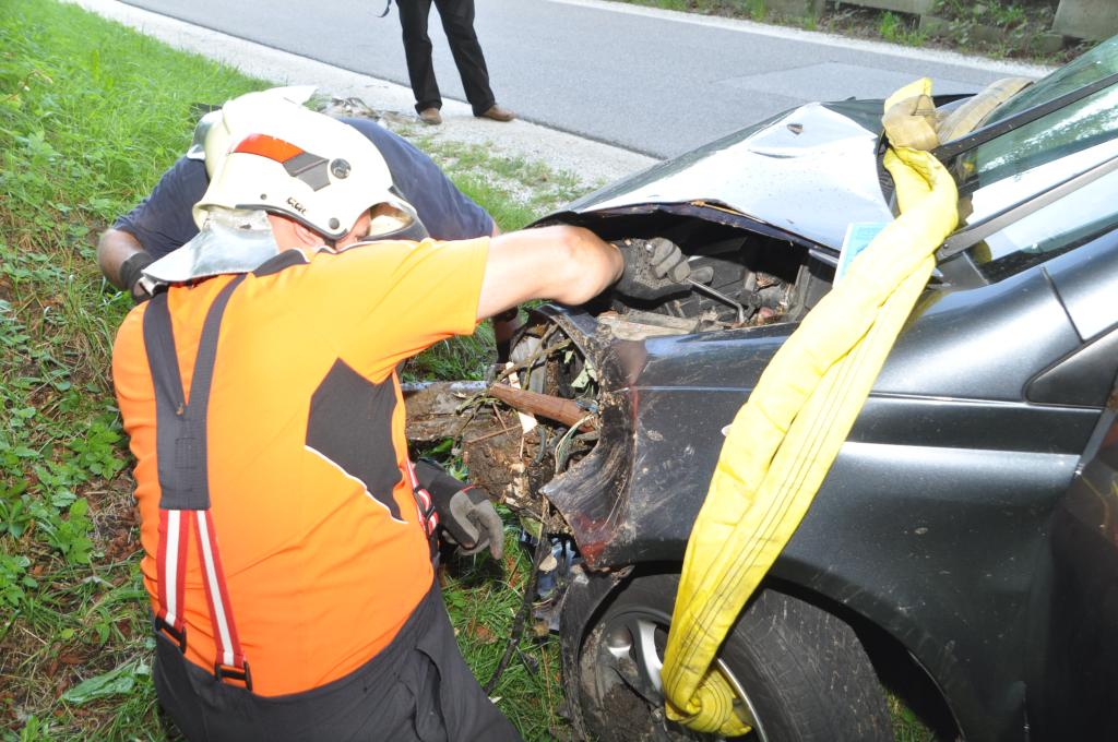 VOITSBERG, am 01.08.2015 Nach Anforderung der FF Gaisfeld wurden die Stützpunktfahrzeuge WLF-Kran und das ÖF zu einer Fahrzeugbergung angefordert. Ein PKW kam aus ungeklärter Ursache von einer Gemeindestraße ab, fuhr einen Lichtmast nieder und stürzte sich überschlagend über eine Böschung und kam mit den Rädern in einem kleinen Bach zu stehen. Die sich im Fahrzeug befindlichen Insassen, eine Frau und ein Kind, konnten sich selbst befreien. Das ebenfalls verständigte Rote Kreuz Voitsberg versorgte Beide und lieferte sie ins LKH Voitsberg ein. Der Grad der Verletzung ist unbekannt. Die Feuerwehren Gaisfeld und Voitsberg kontrollierten die Böschung bezüglich ausgetretener Schmiermittel und rückten danach in die Rüsthäuser ein. Die polizeilichen Erhebungen führte die Polizei durch.