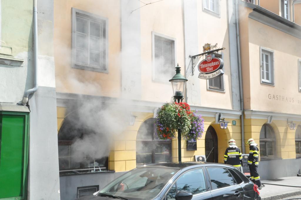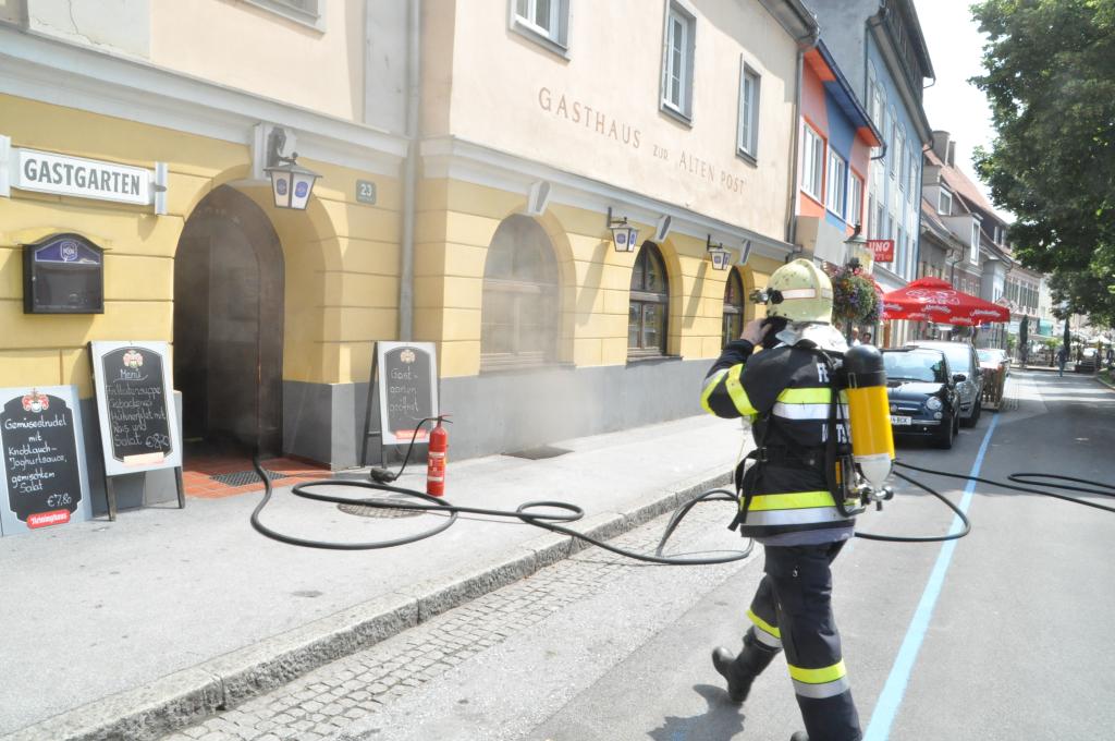 VOITSBERG, am 03.08.2015 Aus unbekannter Ursache brach in der Küche eines Gasthauses am Voitsberger Hauptplatz ein Brand aus. Die sich zahlreich im Gasthaus befindlichen Gäste und das Personal konnten sich selbst retten. Ein Gast versuchte mit Feuerlöschern den Brand zu bekämpfen, erlitt eine leichte Rauchgasvergiftung und wurde mit dem Roten Kreuz in das LKH Voitsberg eingeliefert, konnte es aber kurze Zeit später wieder verlassen. Die Aufgabe der Feuerwehren war der Brandangriff unter schwerem Atemschutz mit zwei Trupps und die Belüftung des Lokals mit zwei Drucklüftern. Letztlich wurde mit einer Wärmebildkamera die gesamte Küche kontrolliert.
