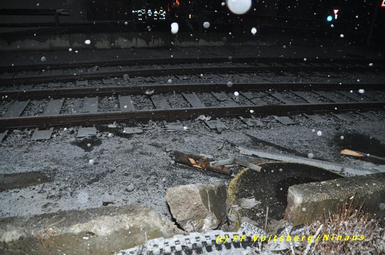 VOITSBERG, am 17.02.2016 Ein PKW durchstieß ein Holzgeländer, stürzte über eine 30 cm hohe Betonmauer auf den Gleiskörper der GKB, schlitterte über diesen, beschädigte dabei wahrscheinlich die Elektrik, flog nochmals über eine 40 cm hohe Betonmauer, riss einen Strom-Verteilerkasten um und kam schlussendlich nach ca. 100 Meter in der Bahnhofstrasse in Voitsberg mit Totalschaden zu stehen. Der vermeintliche Lenker blieb unverletzt.