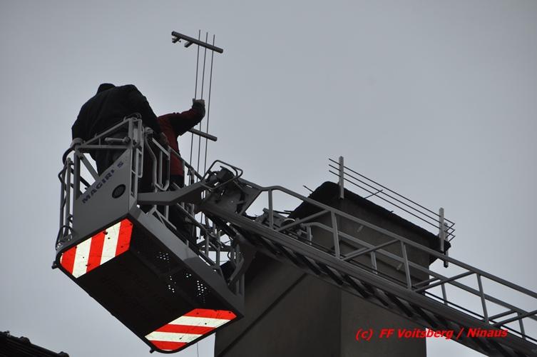 Über den Behördenweg wurden die FF Voitsberg und die FF Köflach eingeladen, sich an dieser Aktion zu beteiligen. Die Aufgabe der FF Voitsberg bestand in der Absicherung der Einsatzstelle von Passanten. Die FF Köflach rückte mit der Drehleiter aus, um die handelnden Kameraden der Berg- und Naturwacht in die Höhe zu hieven, um das neue Nest anbringen zu können. Die Stadtwerke Voitsberg brachte einen Blitzschutz an.