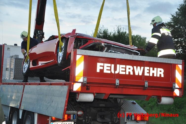 VOITSBERG, am 10.06.2016 Vermutlich wegen überhöhter Geschwindigkeit kam ein PKW auf der LB 70 im Gemeindegebiet Krottendorf in Fahrtrichtung Graz ins Schleudern, geriet auf die rechte Straßenböschung, überschlug sich und schlitterte am Dach ca. 90 Meter auf die linke Straßenseite. Danach stürzte das schwer beschädigte Fahrzeug auf die Straßenböschung und kam neben dem linken Straßenrand zu stehen. Die Wegstrecke, an der sich der Unfall ereignete, wurde seitens der Polizei mit ca. 200 Meter angegeben. Der Lenker und ein Beifahrer hatten riesiges Glück und konnten leicht verletzt aus dem Sportwagen aussteigen, wurden vom Roten Kreuz Voitsberg erstversorgt und danach ins LKH Voitsberg eingeliefert. Das Unfallwrack wurde mit dem WLF-Kran der FF Voitsberg geborgen und von der Unfallstelle entfernt. Ausgelaufene Betriebsmittel wurden seitens der FF Gaisfeld gebunden und fachgerecht entsorgt. Herumliegende Wrackteile wurden von der FF Krottendorf eingesammelt. Die Verkehrsregelung oblag den Wehren Gaisfeld und Krottendorf in Zusammenarbeit mit der Polizei. Man kann wiederum von großem Glück sprechen, dass zum Zeitpunkt des Unfalles auf der sonst sehr stark befahrenen Bundesstraße kein Gegenverkehr herrschte.