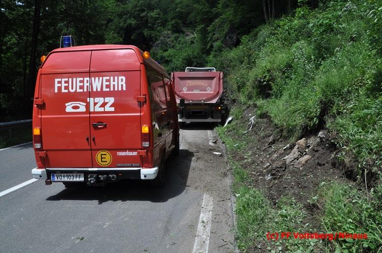VOITSBERG, am 28.06.2016 Ein Sattelschlepper kam am Dienstag, 28.6.2016 kurz nach 13:00 Uhr aus ungeklärter Ursache auf das Bankett der LB 70 in den Kremser Reihen in Fahrtrichtung Voitsberg, touchierte einige Felsen und schlitterte ca. 70 m entlang einer Böschung auf der rechten Fahrbahnhälfte. Dabei wurde sein rechter Treibstofftank aufgerissen, wobei Treibstoff auf die Fahrbahn gelangte. Drei Reifen wurden beim LKW aufgeschlitzt. Die alarmierte FF Krems führte bis zum Eintreffen der Ölstutzpunktfeuerwehr Voitsberg Erstmaßnahmen durch, sicherte die Unfallstelle ab, band einen Teil der ausgeflossenen Betriebsmittel und reinigte die Straße. Die KameradInnen der FF Voitsberg pumpten den restlichen Treibstoff mittels Vakuumpumpe in ein Fass, restliche ausgeflossene Betriebsmittel wurden gebunden und fachgerecht entsorgt. Die Polizei führte die Erhebungen durch und die Straßenmeisterei Voitsberg hob oberflächlich getränktes Erdreich ab und entsorgte dieses fachgerecht. Die Bergung des LKW erfolgte durch eine Fachfirma. Die LB 70 war während der Arbeiten nur einspurig befahrbar. Eingesetzt waren insgesamt 16 KameradInnen mit 5 Fahrzeugen, 5 Polizeibeamte und 4 Mann der Straßenmeisterei.
