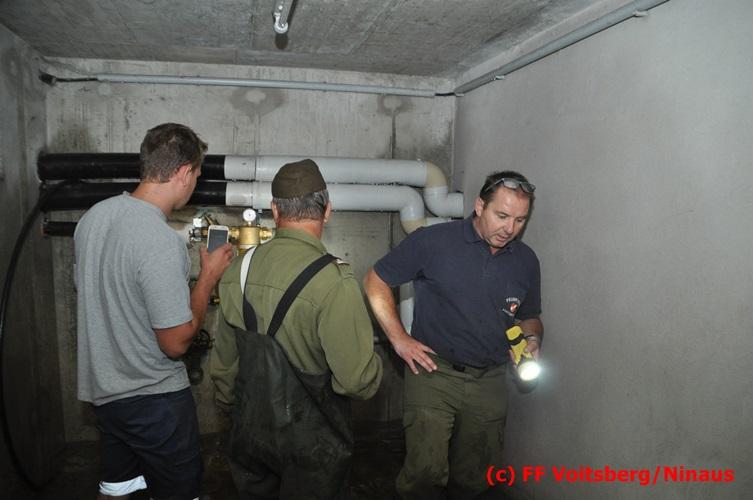 VOITSBERG, am 14.07.2016 Nach einem Wasserrohrbruch in einem Mehrfamilienwohnhaus wurde der Keller im Ausmaß von ca. 400 m2 auf einer Höhe von bis zu 40 cm überschwemmt. Die FF Voitsberg pumpte unter Einsatz von drei Elektro-Tauchpumpen. eines Nasssaugers und unter Verwendung des am HLF 3 installierten Stromgenerators die ca. 150.000 Liter Wasser aus dem Keller. Großer Schaden entstand bei im Keller gelagerten Gegenständen. Durch den hohen Wasserstand war auch die Fernwärmeanlage betroffen. Die Reparatur des defekten Rohres wurde noch in der Nacht von einem Fachunternehmen durchgeführt. 7 KameradInnen konnten nach einem über dreistündigen Einsatz die Kellerräume im fast trockenen Zustand wieder verlassen und einrücken.