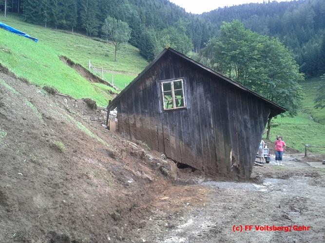 VOITSBERG, am 25.07.2016 Heftige Unwetter im Gemeindegebiet Kainach erforderten bereits seit Mitternacht den Einsatz der FF Kainach. Nach einer Hangrutschung im Bereich Gallmannsegg war ein landwirtschaftliches Anwesen gefährdet. Ein Wirtschaftsgebäude wurde bereits durch Erdmassen verschoben. Die FF Kainach forderte zur Unterstützung die FF Bärnbach, FF Afling und die FF Voitsberg an. Die FF Voitsberg rückte mit KRF – B und VF mit Abdeckplanen und 9 Mann / Frau zur Unterstützung der FF Kainach aus. Unter der Einsatzleitung von HBI DI Wolfgang Scherz und ABI Alfred Jauk wurde mit Planen der offene Hang abgedeckt um ein weiteres Eindringen von Regenwasser zu verhindern und die Rutschung zu stoppen.