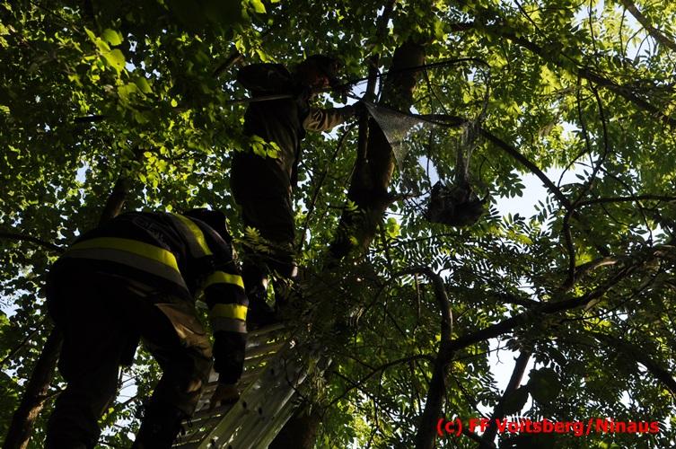 VOITSBERG, am 29.07.2016 Spaziergänger bemerkten im Naherholungsgebiet Grafenteich in Voitsberg einen auf einer Höhe von ca. 5 Meter sitzenden Waldkauz. Durch Bewegungen und Zurufen versuchten sie das Tier zum Wegfliegen zu bringen. Dabei bemerkten sie, dass der Vogel sich mit seinen Läufen an einer Fischerschnur verhakt hatte und damit flugunfähig war. Über die LLZ wurde die FF Voitsberg zur Rettung des Tieres alarmiert. Nach Erkundung durch den Einsatzleiter wurde der Kauz über eine Schiebeleiter unter Zuhilfenahme eines von einem Fischer ausgeliehenen Cacher geborgen und in die Tierklinik nach Rosental eingeliefert. Nach der Erstversorgung wurde das Tier zur Beobachtung in der Klinik belassen.