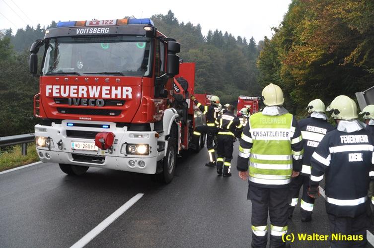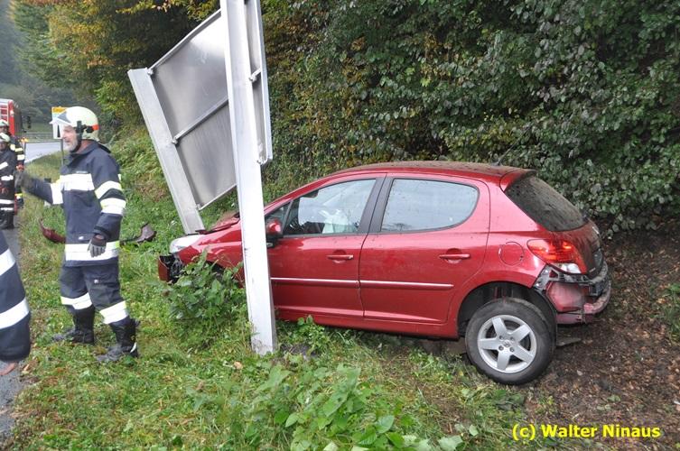 VOITSBERG, am 02.10.2016 In einer unfallträchtigen Kurve der LB 70 in den Kremser Reihen Fahrtrichtung Voitsberg geriet ein PKW von der Straße ab, prallte gegen einen Wegweiser und riss diesen aus seiner Verankerung. Das Fahrzeug verkeilte sich derart, dass der Einsatz des WLF-Kran erforderlich war. Das schwer beschädigte Fahrzeug wurde geborgen und von der Unfallstelle gebracht. Die einsatzleitende Feuerwehr Krems sicherte die Unfallstelle in Zusammenarbeit mit der Polizei ab und barg herumliegende Wrackteile des Fahrzeuges sowie Teile des Wegweisers.