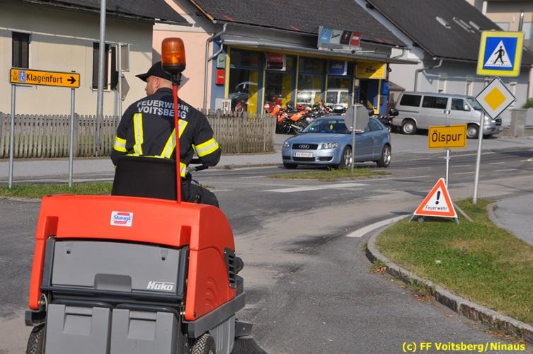 VOITSBERG, am 03.08.2018 Nach einem technischen Gebrechen bei einem LKW verlor dieser Hydrauliköl und verunreinigte die Fahrbahn im Bereich des Kreisverkehrs in der Grazer Vorstadt in Voitsberg auf einer Gesamtlänge von ca. 600 m. Die alarmierte FF Voitsberg band das ausgelaufene Öl, saugte das verunreinigte Bindemittel mit einer feuerwehreigenen Kehrmaschine auf und entsorgte dies fachgerecht. Während des Einsatzes wurde der Verkehr kurz angehalten, was im Frühverkehr auf der Umleitungsstrecke der gesperrten Umfahrung Voitsberg zu ausgedehnten Staus in Richtung Köflach führte. Eingesetzt waren 9 Einsatzkräfte der FF Voitsberg, 2 Kräfte des Bauhofes Voitsberg und 2 Kräfte der Straßenmeisterei Voitsberg. Text und Fotos: Walter Ninaus/FF Voitsberg