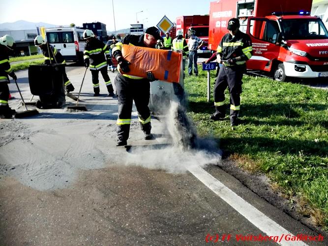 VOITSBERG, am 13.10.2018 Am Samstag, 13. Oktober 2018 in den frühen Nachmittagsstunden stürzte im Kreisverkehr der B 70 in Söding-St.Johann in Richtung Voitsberg ein Behälter mit ca. 600 l Heizöl samt einem PKW-Anhänger um, platzte auf und verteilte sich auf der Fahrbahn der B 70. Die erstalarmierte FF Söding führte Erstmaßnahmen durch, sicherte die Einsatzstelle ab und regelte bis zum Eintreffen der Polizei den Verkehr. Die nachalarmierte Schadstoffstützpunktfeuerwehr Voitsberg band mit Ölbindemittel das ausgeflossene Heizöl, sammelte das durchtränkte Bindemittel ein und entsorgte es fachgerecht. Während des Einsatzes kam es zu einem kurzen Stau auf der B 70. Eingesetzt waren insgesamt 17 Kräfte der Feuerwehren Söding und Voitsberg sowie die Polizei. Verletzt wurde niemand. Fotos: Gallitsch/FF Voitsberg Text: Ninaus/FF Voitsberg