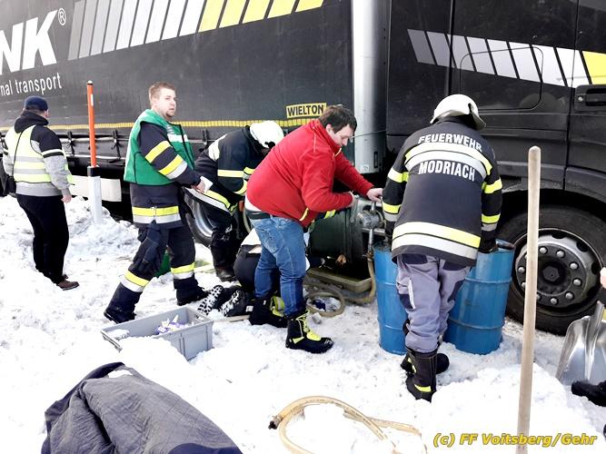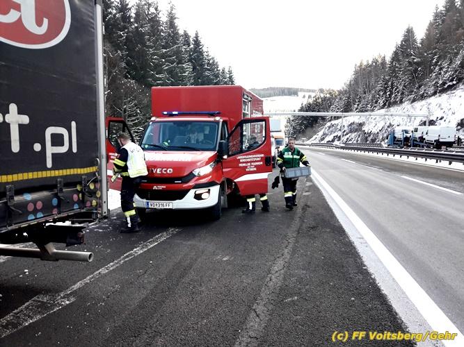 VOITSBERG, am 29.01.2019 Am Dienstag, 29. Jänner 2019 am frühen Nachmittag streifte ein polnischer LKW–Zug im Mitterbergtunnel der A2 mit seinem Tank die Randleiste und beschädigte diesen. Kurz nach dem Tunnel blieb er am Pannenstreifen stehen. Nach ca. 1 Stunde inspizierte ein vorbeifahrendes Fahrzeug der ASFINAG den am Pannenstreifen stehenden LKW und bemerkte den lecken Tank. Um 14.15 Uhr wurde Öl–Alarm ausgelöst und die FF Modriach, FF Pack und der Öl–Schadenszug der FF Voitsberg bzw. der BFV Voitsberg mit den Gefahrgutbeauftragten BI Kremaucz und BI Krenn sowie BR Gehr rückten aus. Der restliche Diesel wurde umgepumpt und das Leck abgedichtet. Der Chemiealarmdienst wurde alarmiert und ordnete das Ausbaggern des kontaminierten Materials an. Die Feuerwehren rückten um 17:30 Uhr wieder ein. Eingesetzt Kräfte: FF Pack FF Modriach Öl – Schadenszug Voitsberg Autobahnmeisterei Autobahnpolizei Chemiealarmdienst Text: Gehr Klaus/FF Voitsberg Fotos: Gehr, Buchegger C. (beide FF Voitsberg)