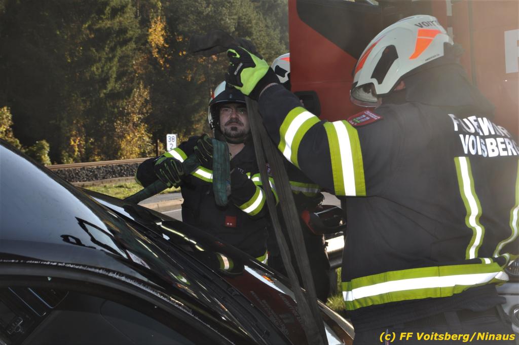 VOITSBERG, am 23.10.2019 Ein spektakulärer Unfall ereignete sich am Mittwoch, 23. Oktober um ca. 8 Uhr auf der B 70 in Rosental. Eine PKW-Lenkerin wurde auf der zweispurigen Richtungsfahrbahn nach Graz von der Sonne derart geblendet, dass sie die Orientierung verlor. Der PKW schlitterte mit der linken Seite auf die Mittelleitschiene, kippte nach rechts auf die Fahrbahn und dann wieder zurück auf die Leitschiene. Dadurch blockierte das Fahrzeug einen Fahrstreifen. Die Lenkerin blieb unverletzt hatte aber großes Glück, da sich die Stange eines Verkehrszeichens durch die Bodenplatte in den Kofferraum bohrte. Wäre dies einen Meter davor passiert, hätte es tragisch ausgehen können. Die alarmierte FF Rosental sicherte die Unfallstelle ab, regelte den Verkehr und band ausgeflossene Betriebsmittel. Zwecks Bergung und Abtransport auf einen gesicherten Platz wurde das WLF-Kran der FF Voitsberg nachalarmiert.