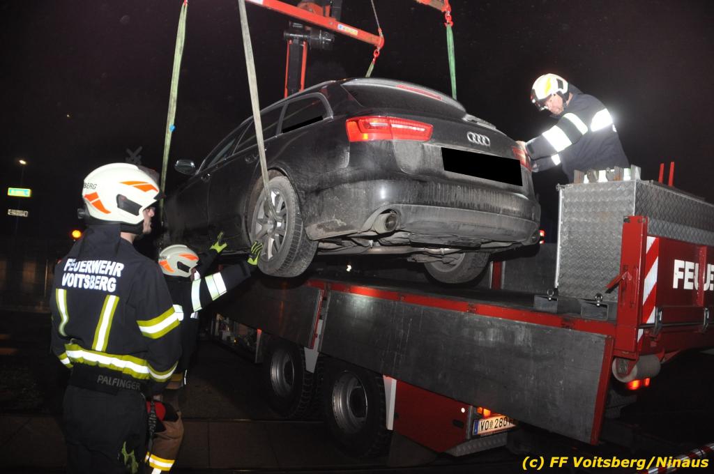 VOITSBERG, am 27.11.2019 Am Mittwoch, 27. November 2019 kam um ca. 1 Uhr ein Fahrzeuglenker mit seinem Fahrzeug bei der Bahnübersetzung in der Arnsteinstrasse in Voitsberg von der Gemeindestrasse ab und landete auf dem GKB-Bahngleis, wo es zu diesem Zeitpunkt zum Glück keinen Zugsverkehr gab. Das Fahrzeug schlitterte über die Gleise und kam mit dem Heck auf diesem zu stehen. Die alarmierte FF Voitsberg barg das leicht beschädigte Fahrzeug mittels dem WLF-Kran und brachte es zu einem gesicherten Abstellplatz. Verletzt wurde niemand. Zwecks Kontrolle des Gleiskörpers wurde der zuständige Mitarbeiter der GKB verständigt, welcher nach kleineren Arbeiten keine Schäden feststellen konnte. Die polizeilichen Erhebungen führten Beamte der PI Voitsberg durch. Eingesetzt waren 6 KameradInnen der FF Voitsberg, die Polizei mit 2 Beamten und der Inspektionsdienst der GKB mit einem Mitarbeiter. Text und Fotos: FF Voitsberg/Ninaus