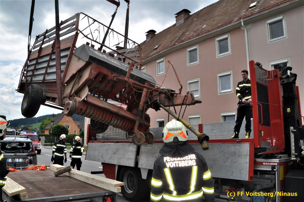 Mit dem WLF-Kran der FF Voitsberg wurde das landwirtschaftliche Gerät geborgen und zu einem Abstellplatz transportiert. Die FF Voitsberg richtete während der Bergungsarbeiten eine Umleitung über die Bahnhofstraße ein und reinigte die Straße von herumliegenden Wrackteilen.