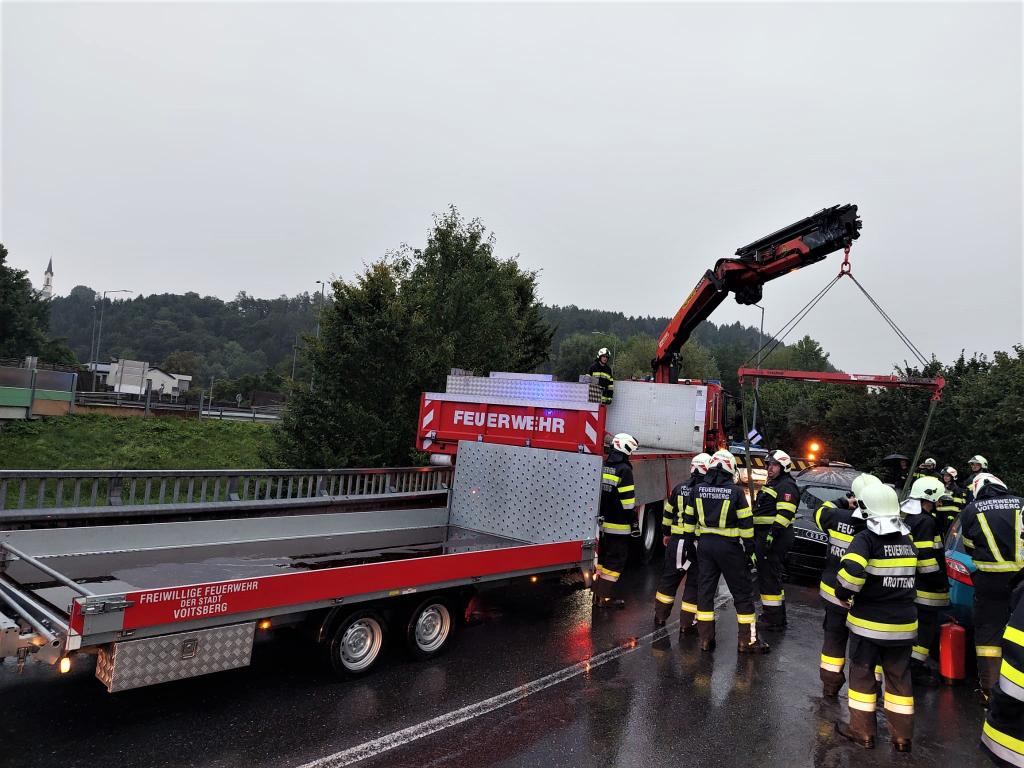 VOITSBERG, am 26.08.2021 Über Anforderung der einsatzleitenden Feuerwehr Krottendorf wurde die FF Voitsberg zwecks Bergung von zwei verunfallten Fahrzeugen mit dem WLF-Kran alarmiert.