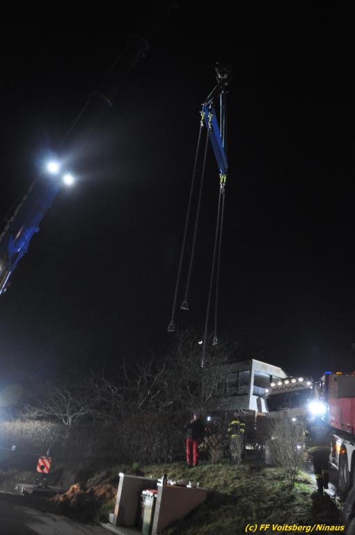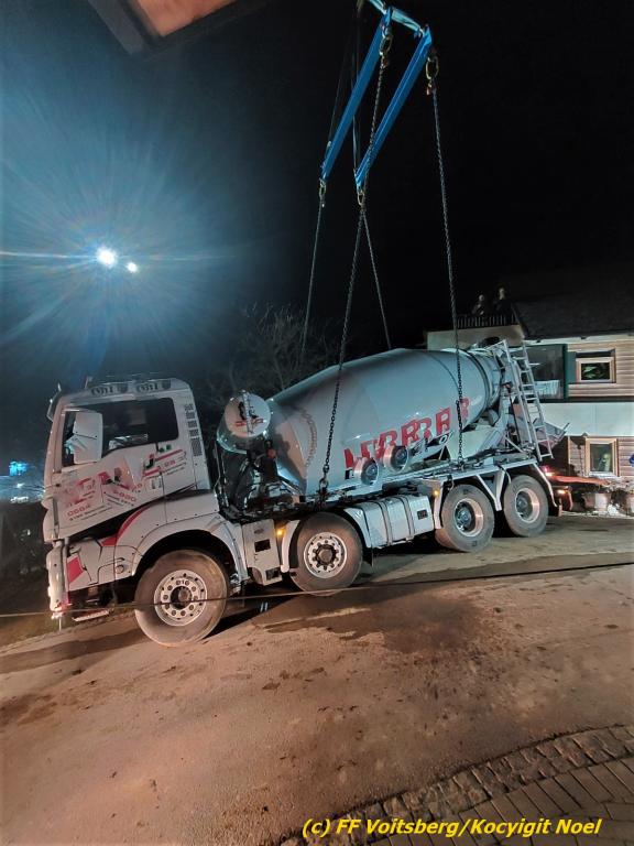 Nach umfangreichen Vorbereitungsarbeiten durch die Fachfirma mit Unterstützung der FF Voitsberg wurde das 35t schwere Fahrzeug unter Mithilfe der Seilwinde des WLF Voitsberg und den Pumpwagen sicher auf die Privatstrasse gehoben und konnte die Fahrt auf eigener Achse fortsetzen.