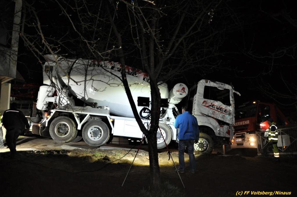 Ein beladener 4-Achs-Betonmischer kam beim Rückwärtsfahren auf einer Privatstrasse von dieser ab und geriet mit der rechten Seite in eine aufgeweichte Wiese und drohte umzustürzen.