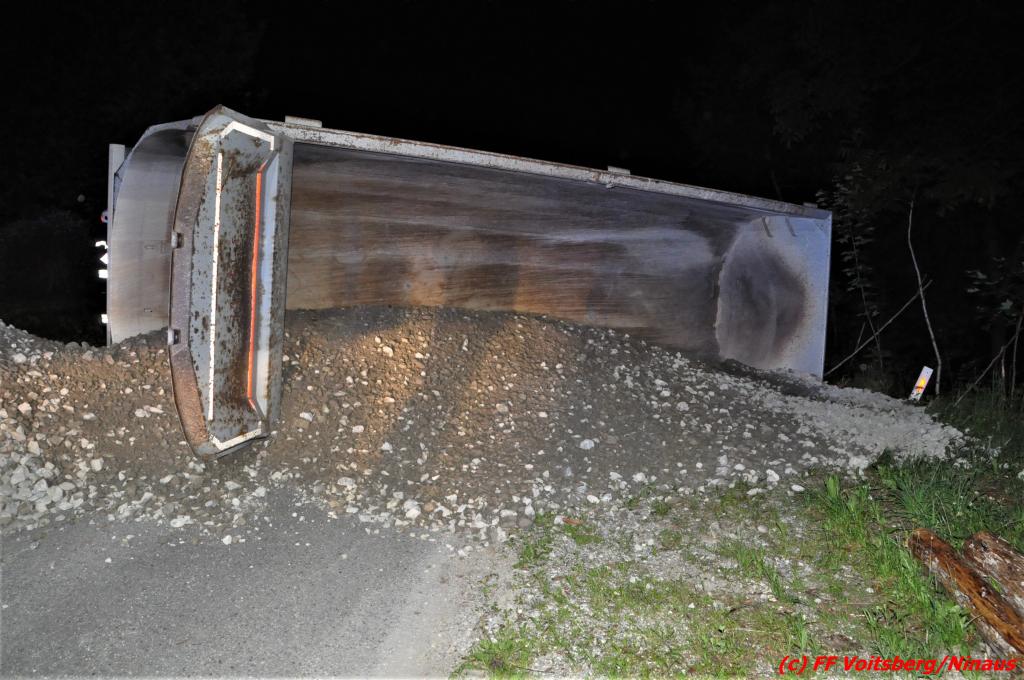 Der Unfall ereignete sich während des Entladens von Schotter, nachdem der aufgekippte Aufleger umstürzte und das Zugfahrzeug mitriss. Zwei anwesende Personen waren unmittelbar zur Stelle und retteten gemeinsam den Lenker durch die Dachluke.