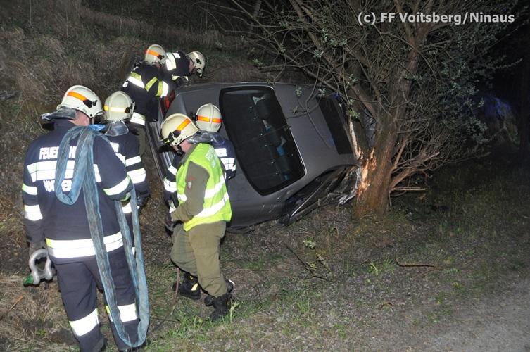 VOITSBERG, am 29.04.2015 Ein aus Tregist kommender PKW musste nach Angaben des Fahrzeuglenkers ein Reh ausweichen, verriss den PKW, kam von der Straße in einer Rechtskurve links ab und prallte frontal gegen einen Baum und beschädigte die rechte Seite des PKW sehr stark. Er konnte sich wie durch ein Wunder fast unverletzt aus dem Wrack befreien. Beim Aufprall traten Schmier- und Treibstoffe aus und wurden mittels Bindemittel gebunden und fachgerecht entsorgt. Während der gesamten Bergearbeiten wurde ein einfacher Brandschutz aufgebaut. Die Bergung erfolgte mit dem WLF-Kran mit Seilwinde. Die Polizei Voitsberg führte Vorort Erhebungen durch. Das ebenfalls anwesende Rote Kreuz versorgte den Leichtverletzten.