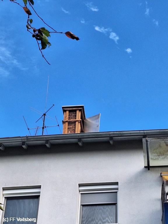 VOITSBERG, am 15.09.2024 Durch den Sturm löste sich ein Teil der Kaminumrandung und fiel zu Boden. Die MRAS-Einheit der FF Voitsberg sicherte den Rest der Umrandung mit Ratschengurten. Der Platz vor dem Mehrfamilienhaus wurde gesichert und gesperrt.