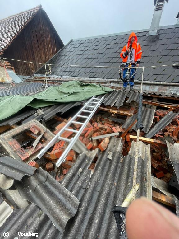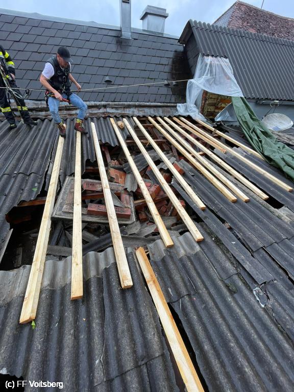 Die FF Voitsberg sicherte in Zusammenarbeit mit privaten Personen die Einsatzstelle am Voitsberger Hauptplatz und machte das Dach provisorisch mit Planen aufgrund starken Regens dicht.