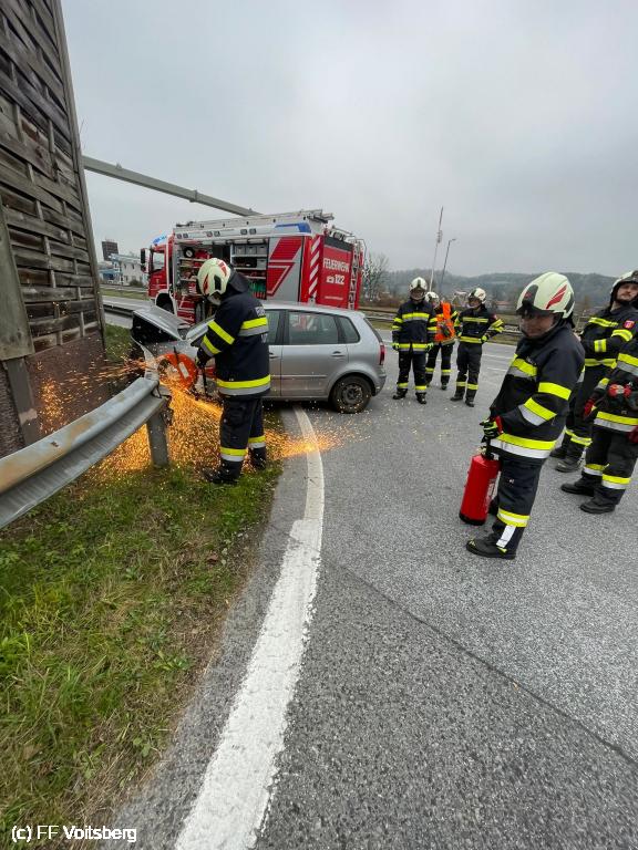Die FF Voitsberg schnitt das festgefahrene und schwer beschädigte Fahrzeug nach Rücksprache mit der Straßenverwaltung mittels Trennschleifer frei, band ausgelaufene Betriebsmittel und stellte es auf einem gesicherten Platz ab.