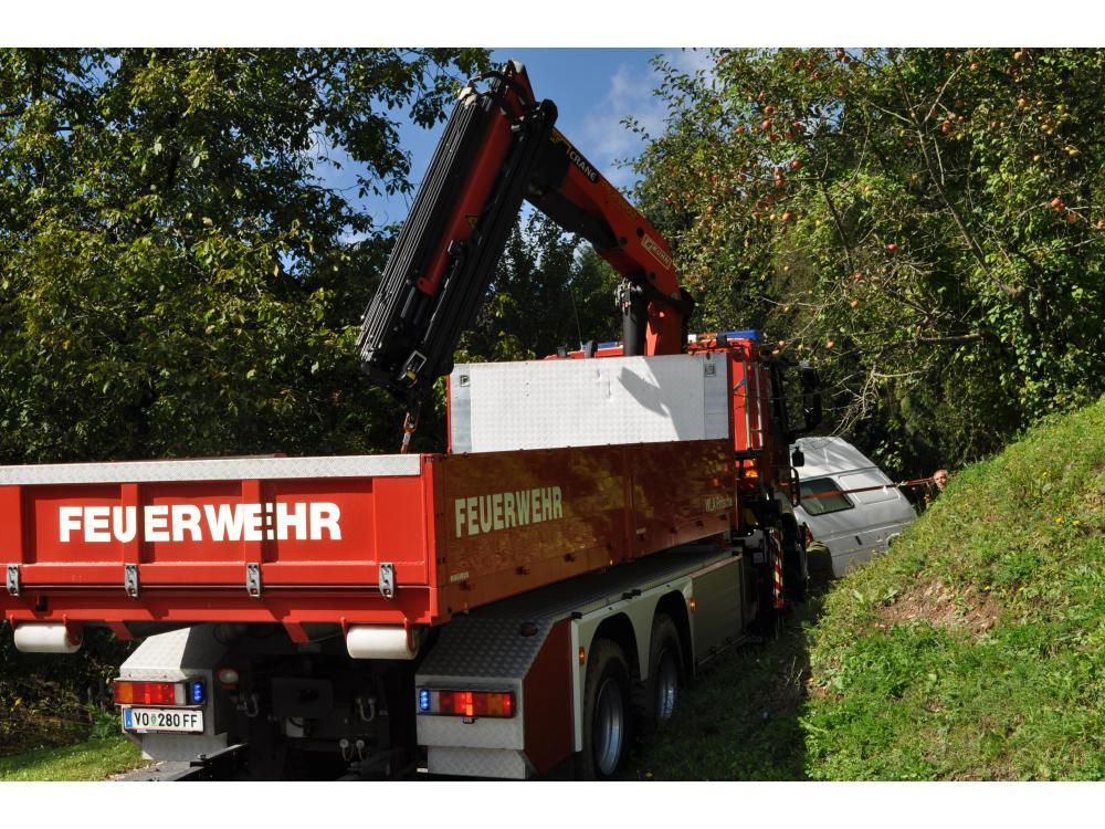 VOITSBERG, am 25.09.2012 Aus ungeklärter Ursache geriet ein Kleinbus auf das Bankett einer Privatstraße und rutschte seitlich gegen einen Strauch, blieb dort hängen und drohte umzustürzen. Die alarmierte FF Kainach sicherte mit dem Fahrzeugbesitzer das Fahrzeug und alarmierte über die LLZ das WLF-Kran der Stadtfeuerwehr Voitsberg. In Zusammenarbeit beider Wehren gelang es mittels Kran und Hubzug, das Fahrzeug unbeschädigt auf die Straße zu stellen.