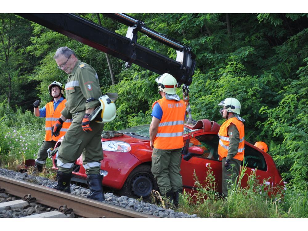 VOITSBERG, am 26.07.2012 Aus ungeklärter Ursache geriet ein PKW auf der B 70 zwischen Rosental und Köflach rechts von der Straße ab, schlitterte über den Gleiskörper der GKB, überschlug sich und kam auf den Rädern neben dem Bahnkörper zu stehen. Die sich im PKW befindlichen Personen konnten sich unverletzt aus dem stark beschädigten Fahrzeug befreien und die Hilfskräfte alarmieren. Die Züge konnten während der Bergungsarbeiten die Unfallstelle nur im Schritttempo passieren. Das Fahrzeug wurde in Zusammenarbeit der Feuerwehren Rosental und Voitsberg mit dem WLF-Kran der Stadtfeuerwehr Voitsberg geborgen und abtransportiert. Die polizeilichen Erhebungen wurden von der Inspektion Köflach durchgeführt.