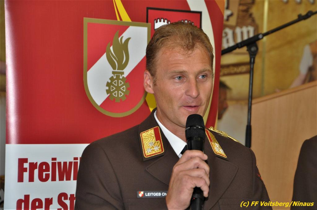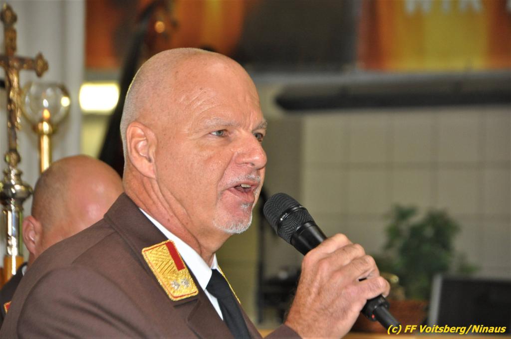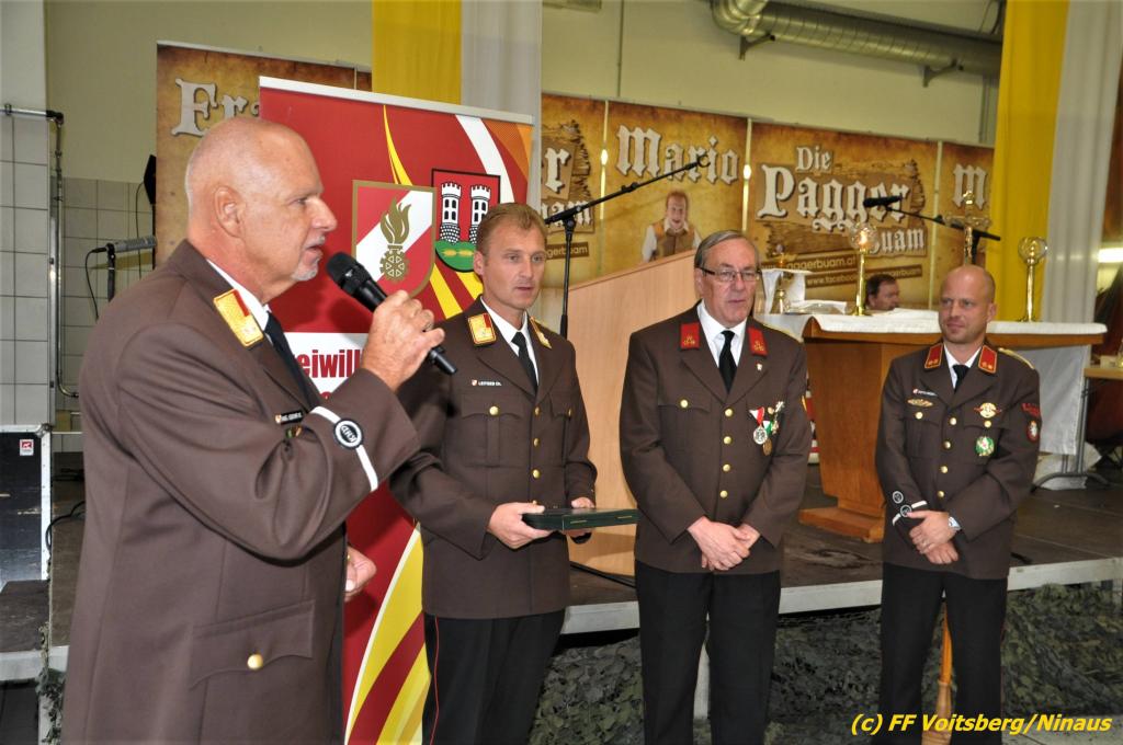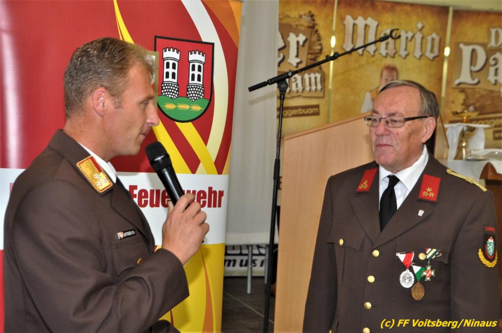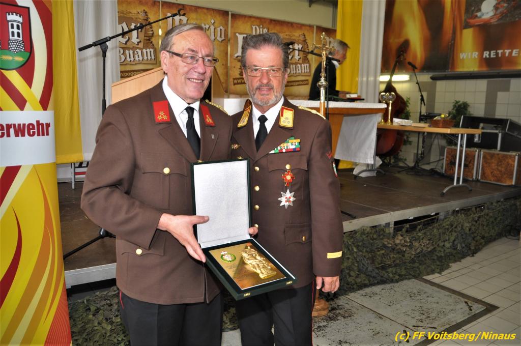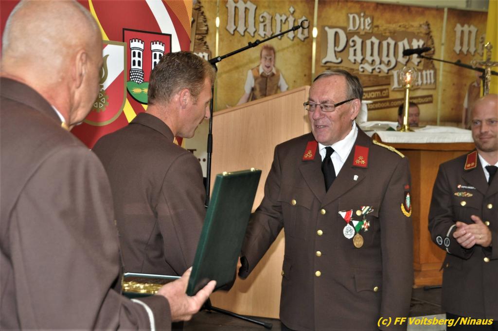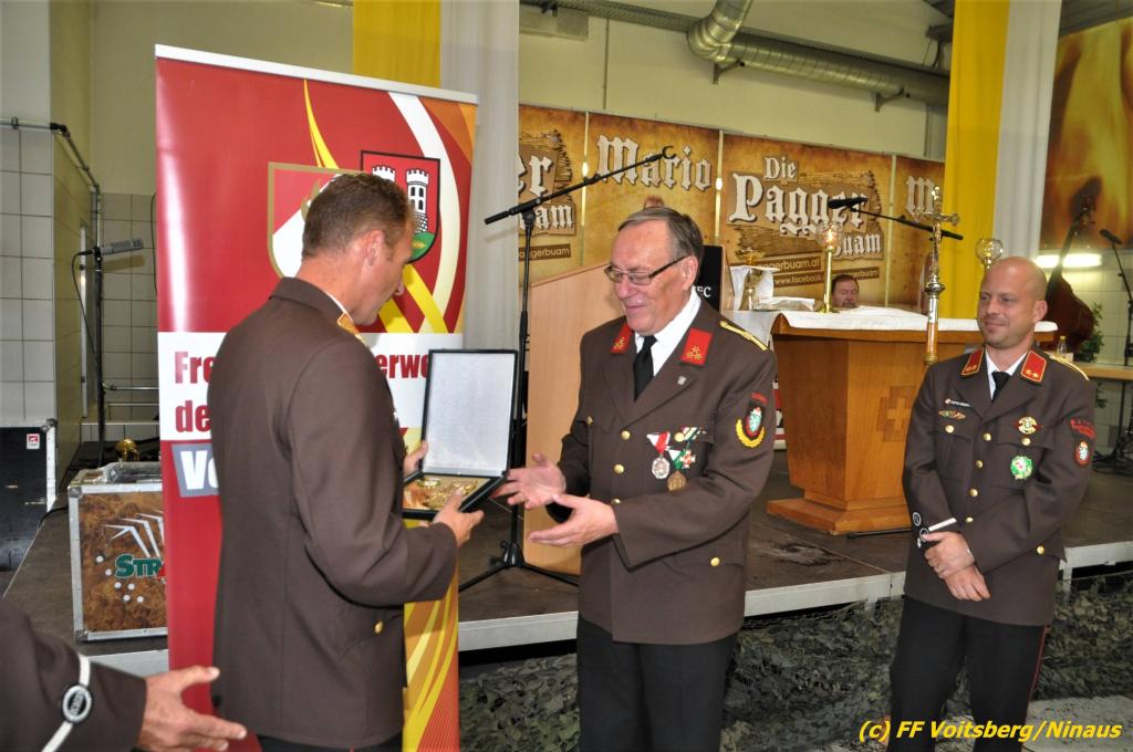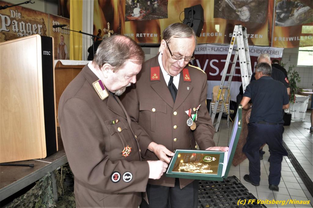 VOITSBERG, am 25.08.2019 Im Anschluss erfolgte eine Verleihung einer besonderen Auszeichnung. Altbürgermeister Ernst Meixner wurde über Antrag von BR Ing. Klaus Gehr von OBR Christian Leitgeb seitens des Landesfeuerwehrverbandes Steiermark mit der Florianiplakette in Gold ausgezeichnet. Diese Auszeichnung ist eine der höchsten, welche an Personen verliehen werden kann, welche nicht im Aktivstand einer Feuerwehr geführt werden.