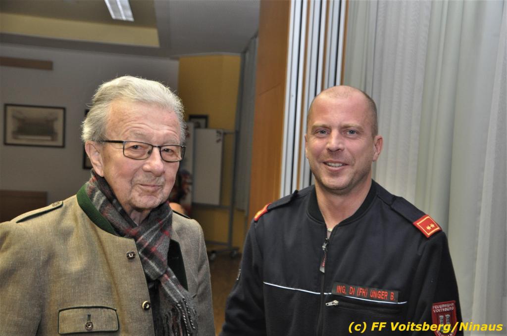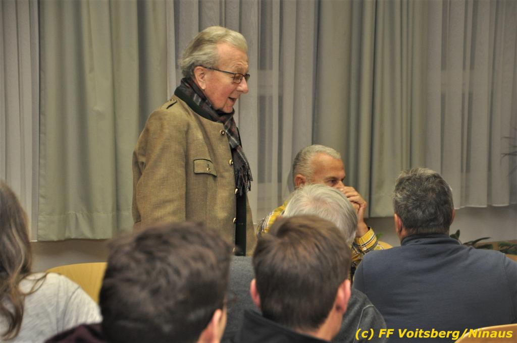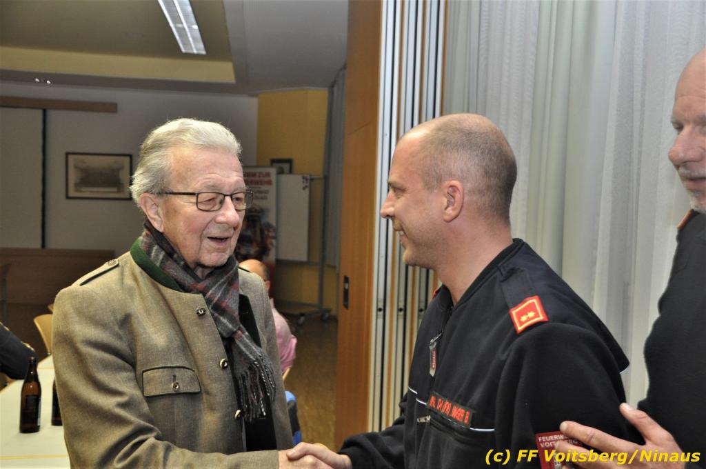 VOITSBERG, am 28.10.2019 Karl Strablegg, langjähriger Landesfeuerwehrkommandant der Steiermark (1976-1996), Vizepräsident des Österr. Bundesfeuerwehrverbandes, Bezirksfeuerwehrkommandant und Kommandant der Stadtfeuerwehr Voitsberg lud aufgrund seiner Vollendung des 90. Lebensjahres die Mitglieder seiner Stammfeuerwehr in den Schulungsraum der FF Voitsberg. Wehrkommandant BR Ing. Klaus Gehr begrüßte den Jubilar und skizzierte ausführlich seinen Werdegang in der FF Voitsberg, dem Bereichsfeuerwehrverband, dem Landesfeuerwehrverband und dem Österr. Bundesfeuerwehrverband. Er war mit seiner Denkensweise immer einen Schritt voraus. Karl Strablegg dankte in Worten der Freunde seinen Wehrkameraden und brachte einige „Zuckerl“ aus seinen Tätigkeiten aus der Familie, seinem Leben als Fleischhauermeister und seiner einzigartigen Karriere bei der Feuerwehr. Abschließend lud er zu einem Abendessen, wofür sich die KameradInnen auf der herzlichste bedanken möchten und noch viele gesunde Jahre dem Jubilar wünschten.