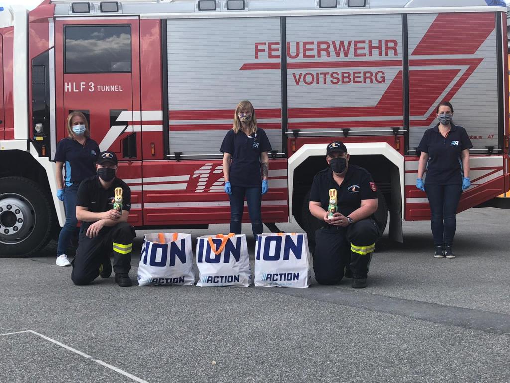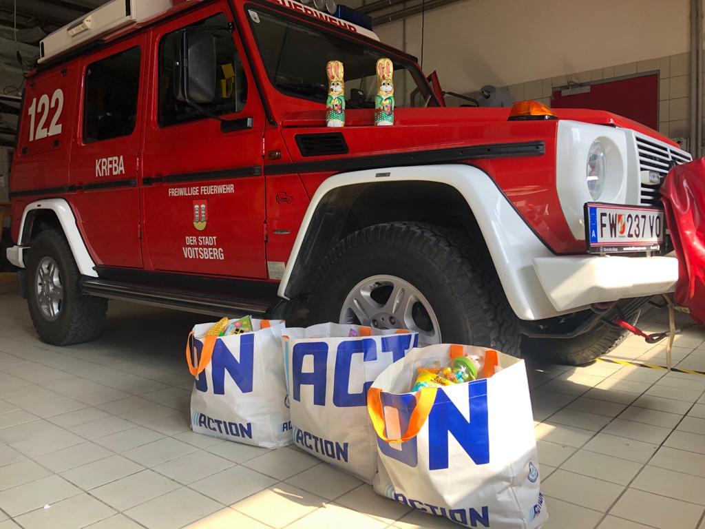 VOITSBERG, am 11.04.2020 Am Karsamstag besuchten Vertreterinnen der Firma Action der Filiale in Voitsberg die benachbarte Feuerwehr Voitsberg und übergaben den diensthabenden Kameraden stellvertretend für die Feuerwehrmitglieder für ihre Dienst- und Einsatzbereitschaft zum Wohle der Bevölkerung in dieser außergewöhnlichen Zeit Ostergeschenkartikel.