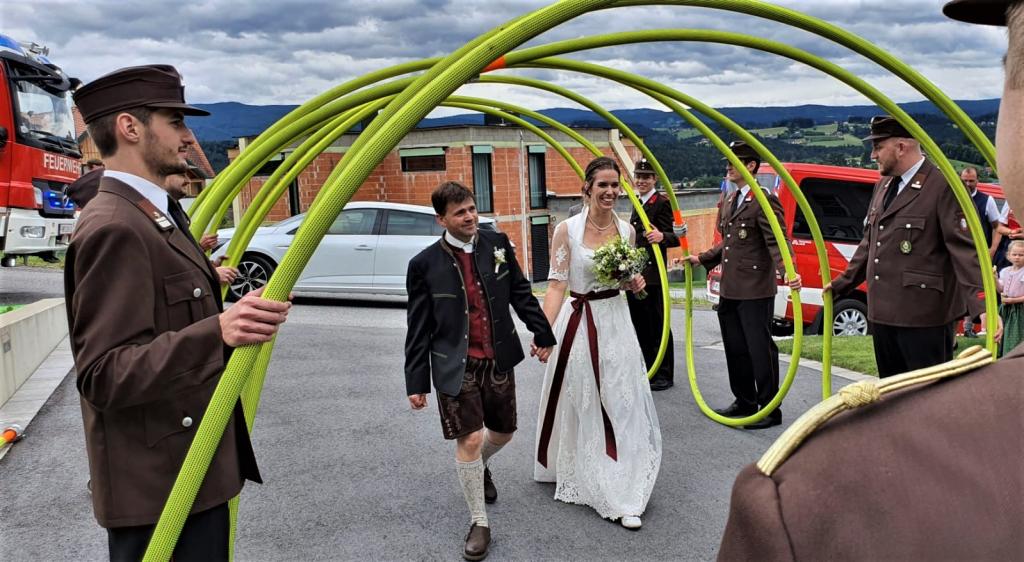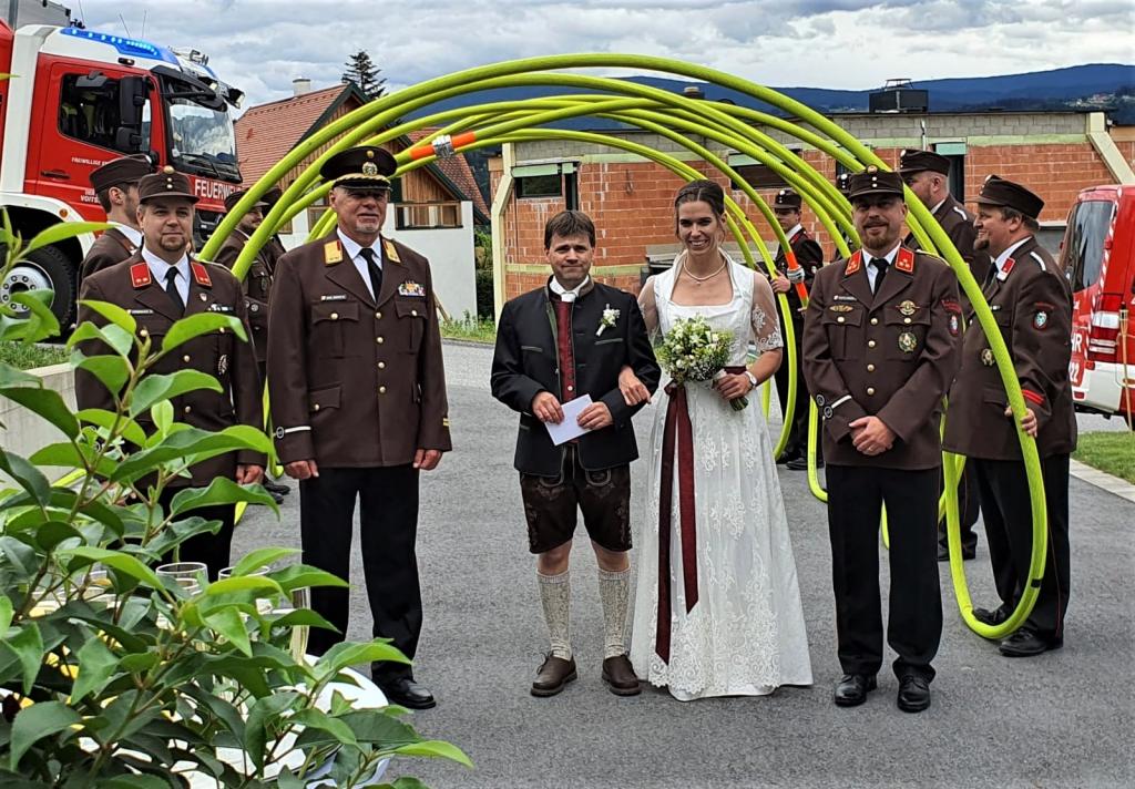 Eine Abordnung der FF Voitsberg empfing das Brautpaar im Spalier. BR Klaus Gehr - mit ihm führte Michael die FF Voitsberg von 2012 bis 2017 - überbrachte die Glückwünsche gemeinsam mit HBI Bernd Unger und OBI Harald Kremaucz.