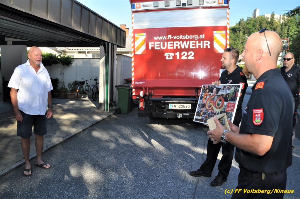 Der langjährige, ehemalige Kommandant der Stadtfeuerwehr Voitsberg, Brandrat Ing. Klaus Gehr vollendete am Sonntag, 5. Juli 2020 die Vollendung seines 60. Lebensjahres. Seine KameradInnen der Stadtfeuerwehr Voitsberg überraschten ihn an seinem Geburtstag mit einem Besuch bei sich zuhause und fuhren mit den Einsatzfahrzeugen unter Folgetonhorn und eingeschaltenem Blaulicht vor.