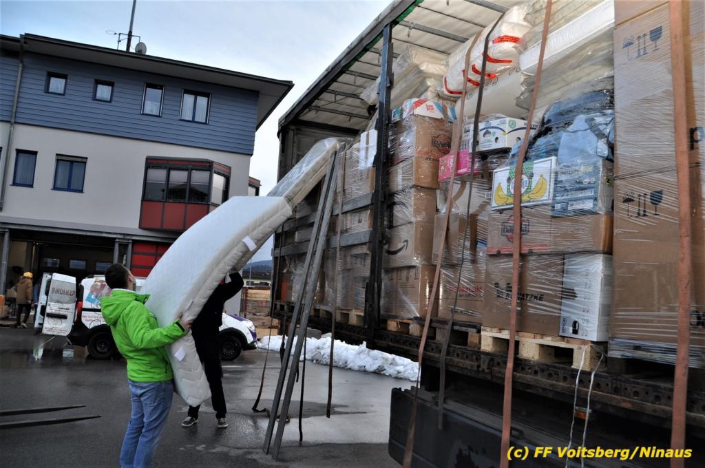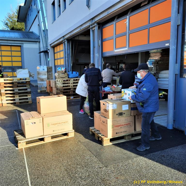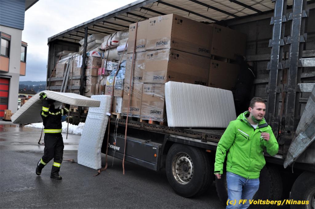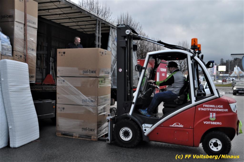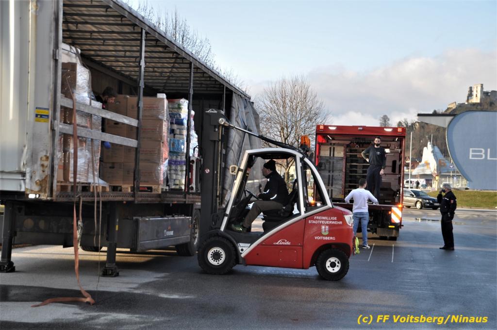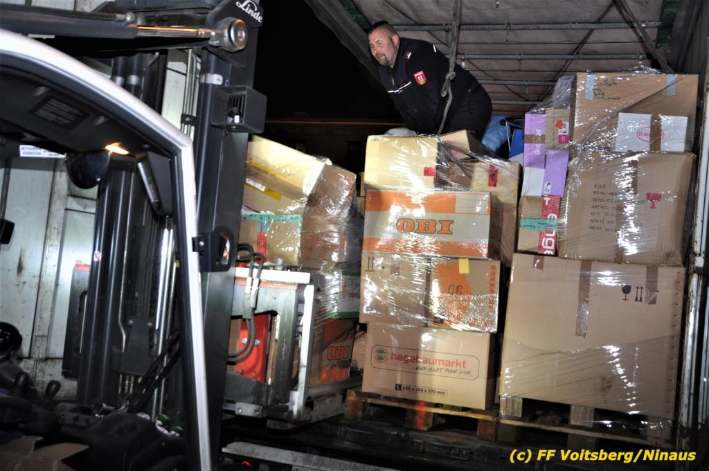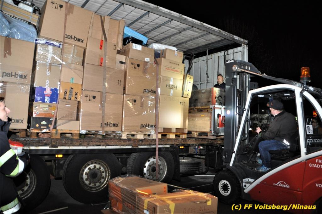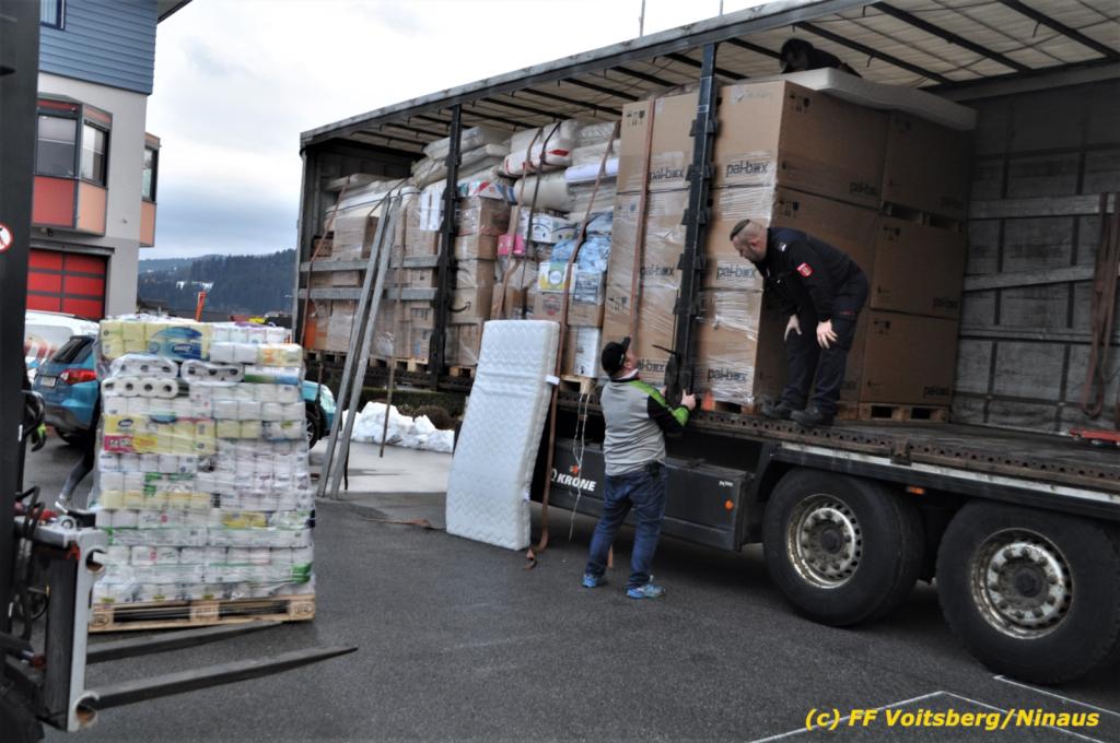 Die Aktion startete am Dienstag, 5. Jänner um 8 Uhr und die FF Voitsberg stand mit bis zu 25 KameradInnen bereit, die Waren von der Bevölkerung zu übernehmen, zu sortieren und zu palettieren. Es war aber so viel an Spendenfreudigkeit festzustellen, dass schon am Dienstag am Nachmittag die Spendenaktion, welche bis Mittwochmittag geplant war, aus Kapazitätsgründen abgebrochen werden musste. Der ursprünglich eingeplante Sattelschlepper war bereits voll beladen, sodass ein zweiter bestellt wurde.