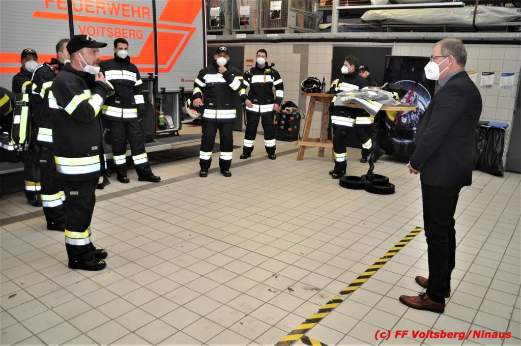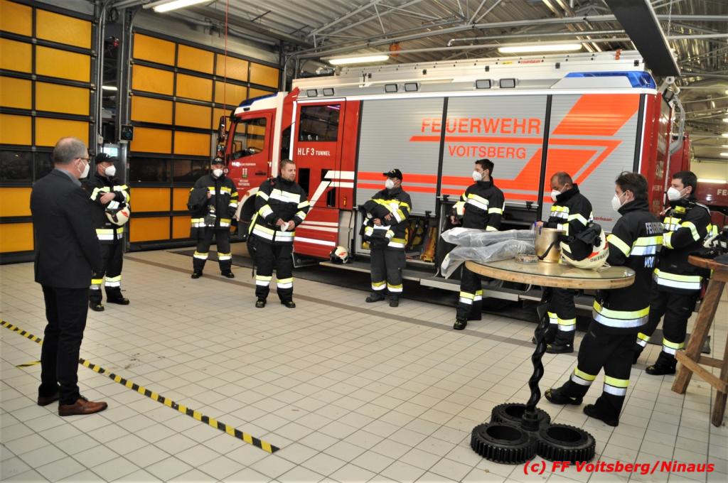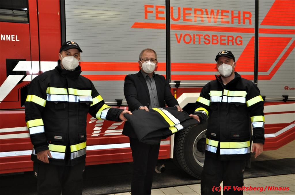 Bürgermeister Mag. (FH) Bernd Osprian übergab am Montag, 15. März 2021 unter Einhaltung der Corona-Regeln diese neue Uniformierung der Mannschaft. Wehrkommandant HBI DI (FH) Bernd Unger und sein Stellvertreter Harald Kremaucz bedankten sich bei der Stadtgemeinde Voitsberg unter Bgm. Osprian für diese Anschaffung.