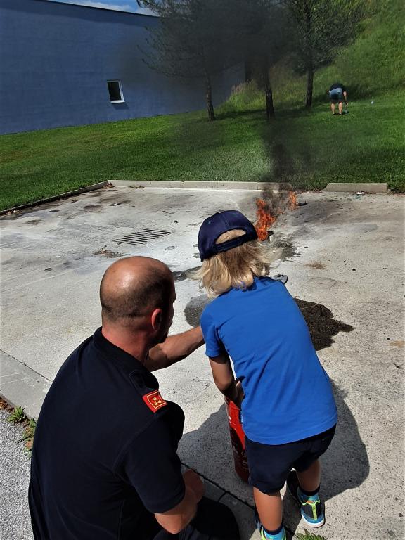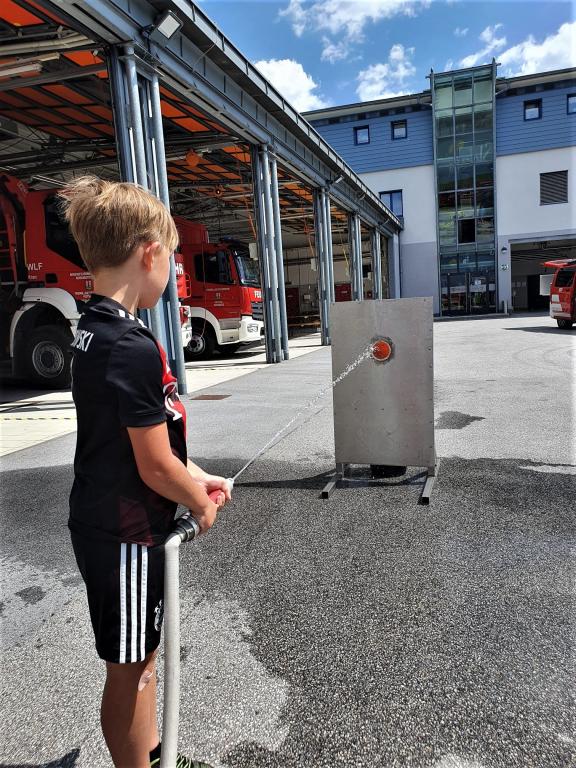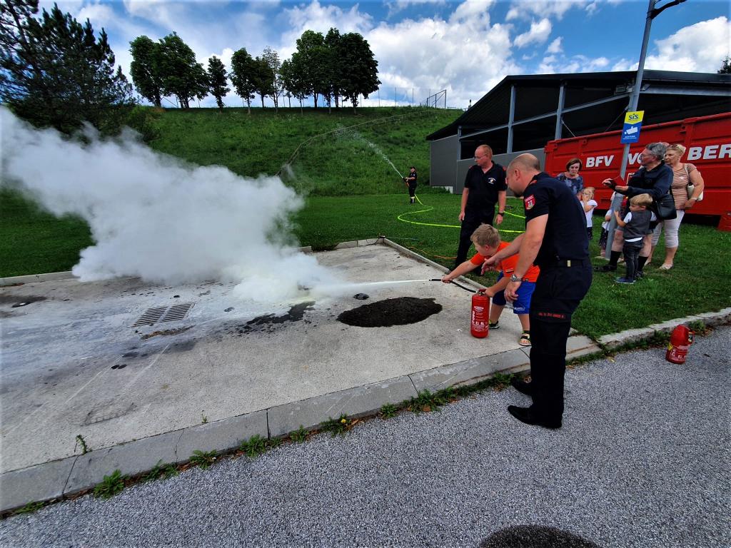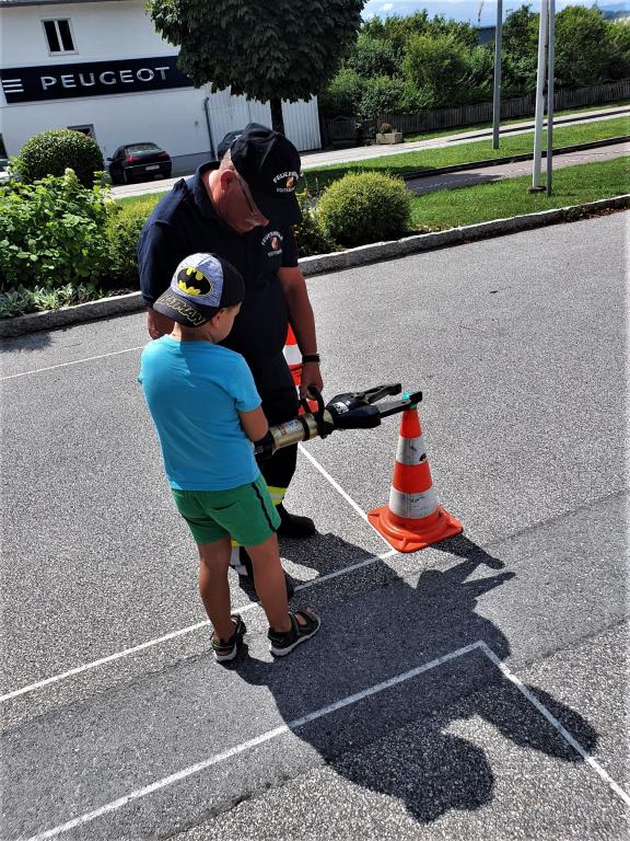 Nach einer kurzen Einweisung ging es zu insgesamt fünf Stationen. Die Kinder konnten mit einer Kübelspritze und dem Strahlrohr spritzen, mit einem hydraulischen Spreizer einen Ball auf einem Verkehrsleitkegel platzieren, ein Auto mittels Hebekissen anheben und sogar selbstständig mit Feuerlöschern einen Kleinbrand bekämpfen. Weiters konnten die Feuerwehrautos von innen besichtigt werden. Von den Kameradinnen und Kameraden konnten alle Fragen der wissbegierigen Kinder und deren Eltern beantwortet werden.