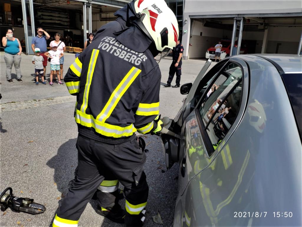 Als weiterer Programmpunkt wurde eine reale Einsatzübung abgehalten. Bei der Übung wurde ein verunfallter Lenker mittels hydraulischen Rettungsgerät aus seinem PKW befreit. Bereits nach wenigen Minuten meldete der Übungsleiter dem staunenden Publikum das Einsatzende, welches mit Applaus honoriert wurde.