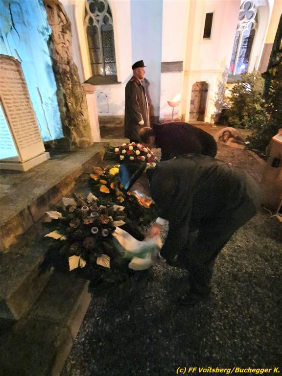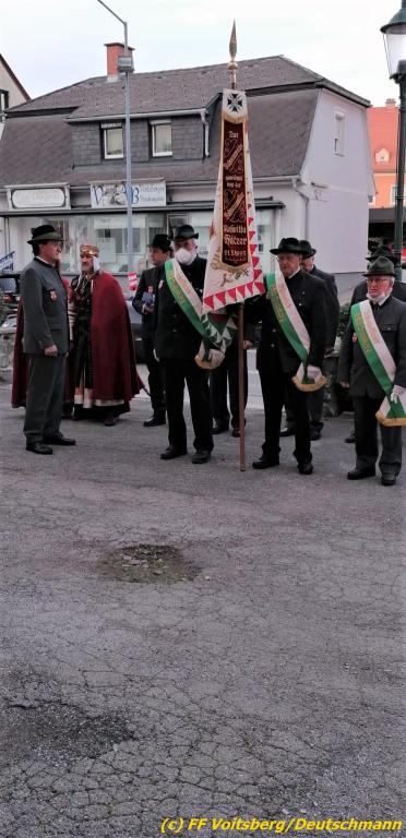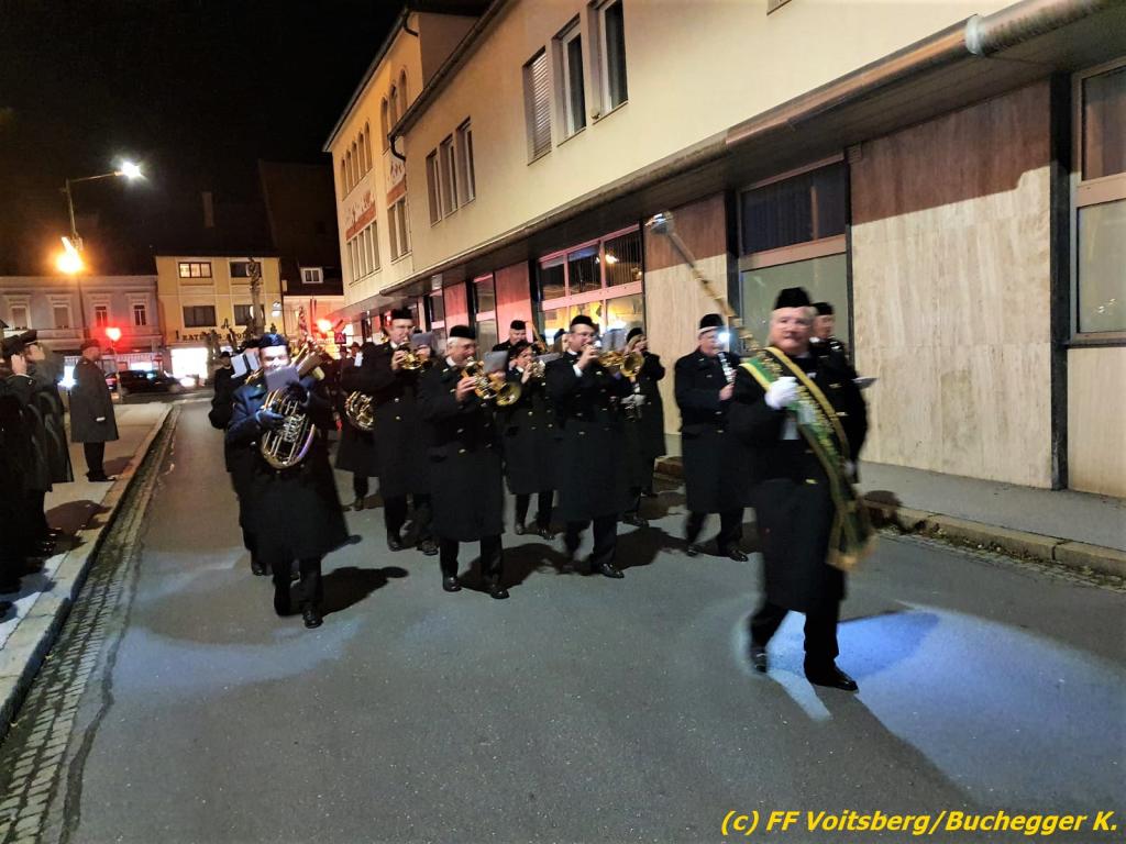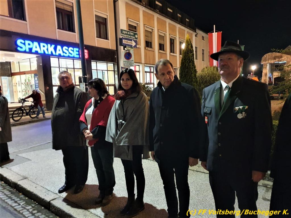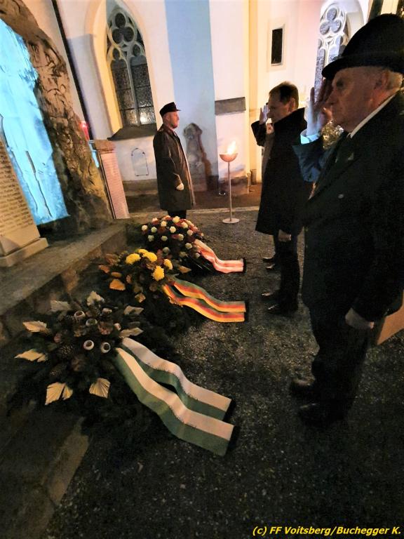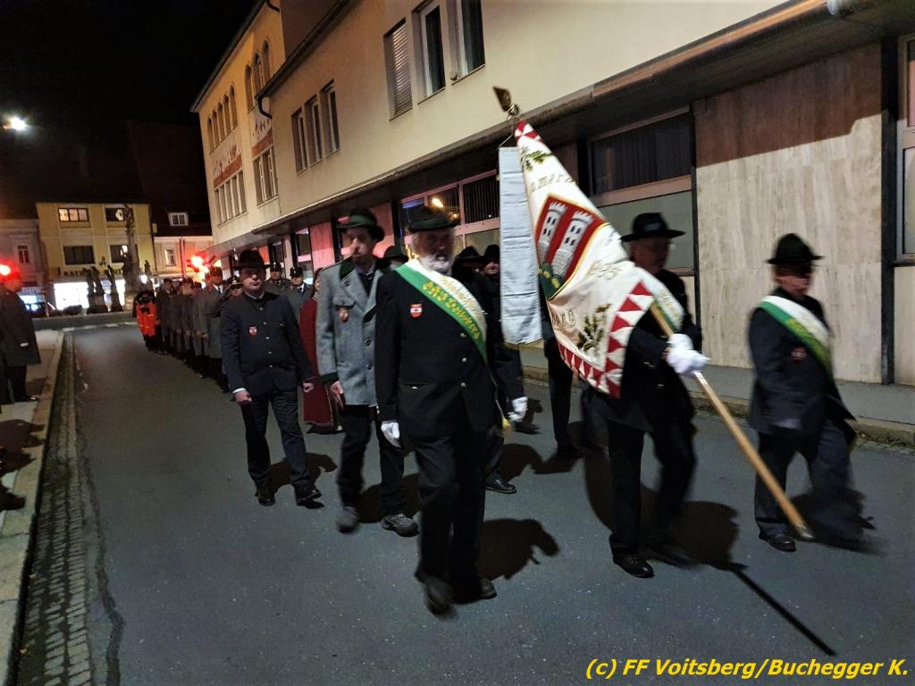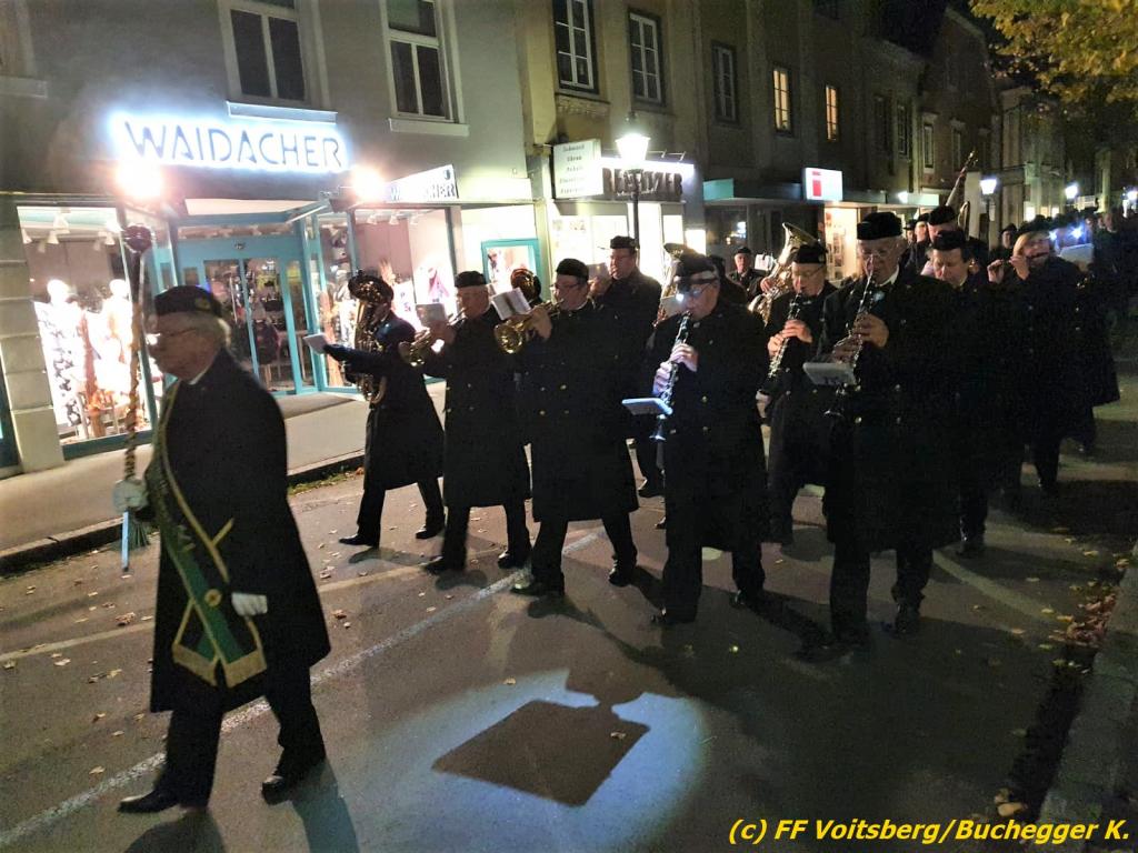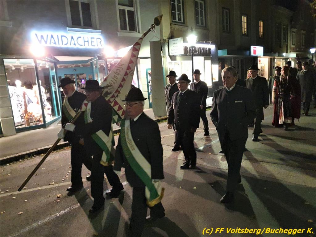 Nach einer Gedenkmesse, zelebriert vom Seelsorger Mag. Josef Paier in der St. Josefskirche, marschierte der Gedenkzug, bestehend aus Abordnungen des Kameradschaftsbundes Voitsberg, der FF Voitsberg, der FF Krems, der Feuerwehrjugend Voitsberg, der Alt-Kainacher Ritterschaft und der Bergkapelle Hödlgrube-Zangtal zum Kriegerdenkmal in der Bahnhofstrasse.