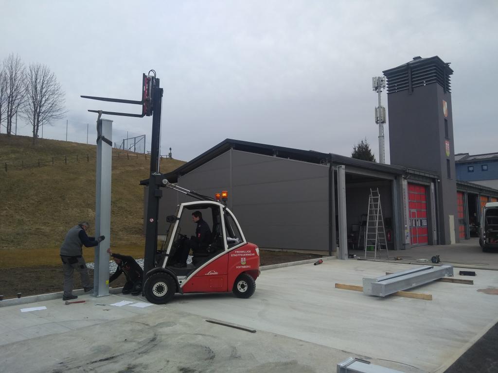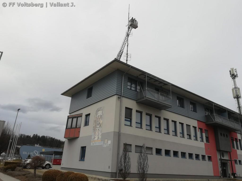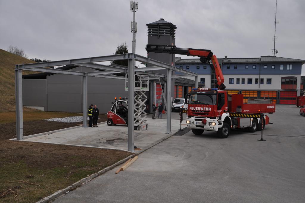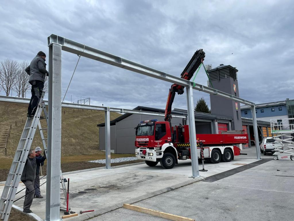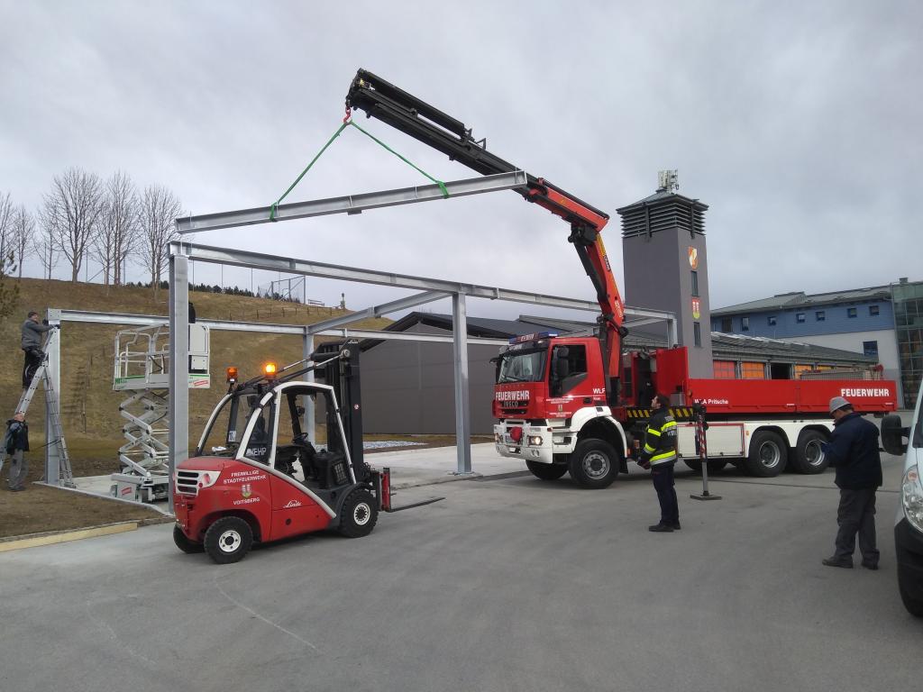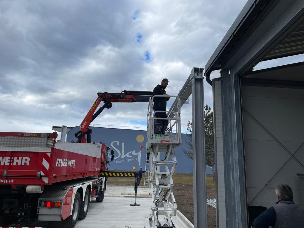 VOITSBERG, am 25.02.2022 Beim Feuerwehrhaus der Feuerwehr Voitsberg wurden in der letzten Februarwoche 2022 wieder zwei Zukunftsprojekte in Angriff genommen. Es wurde ein Zubau für die Wechselcontainer aufgestellt und weiter erfolgte die Antennenmontage für bessere Kommunikation
