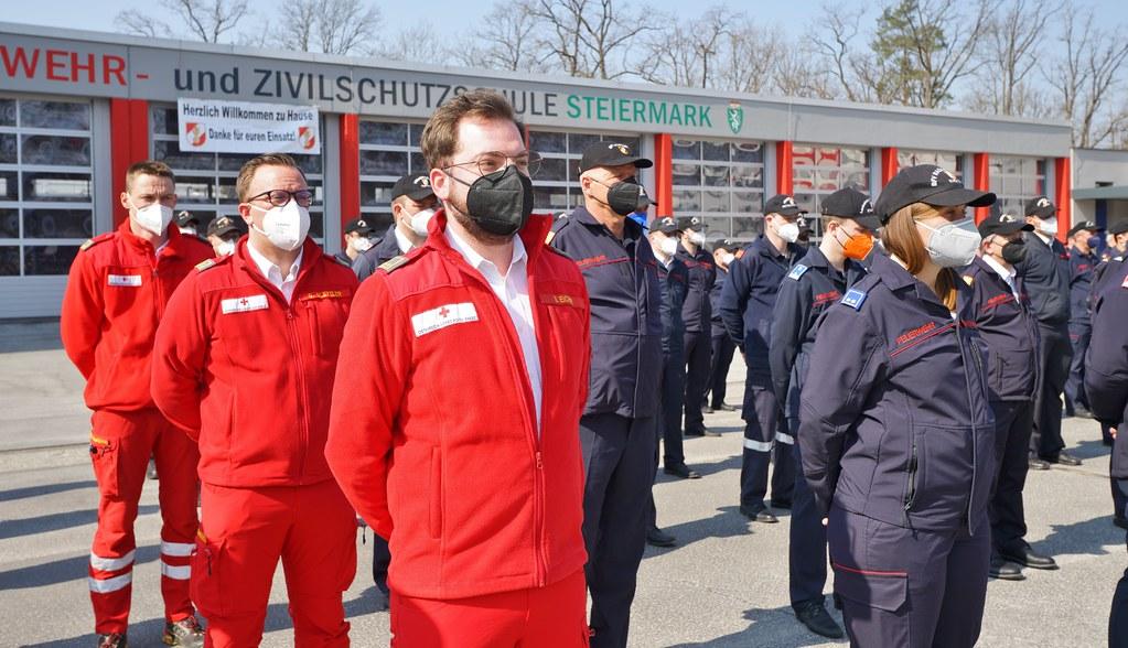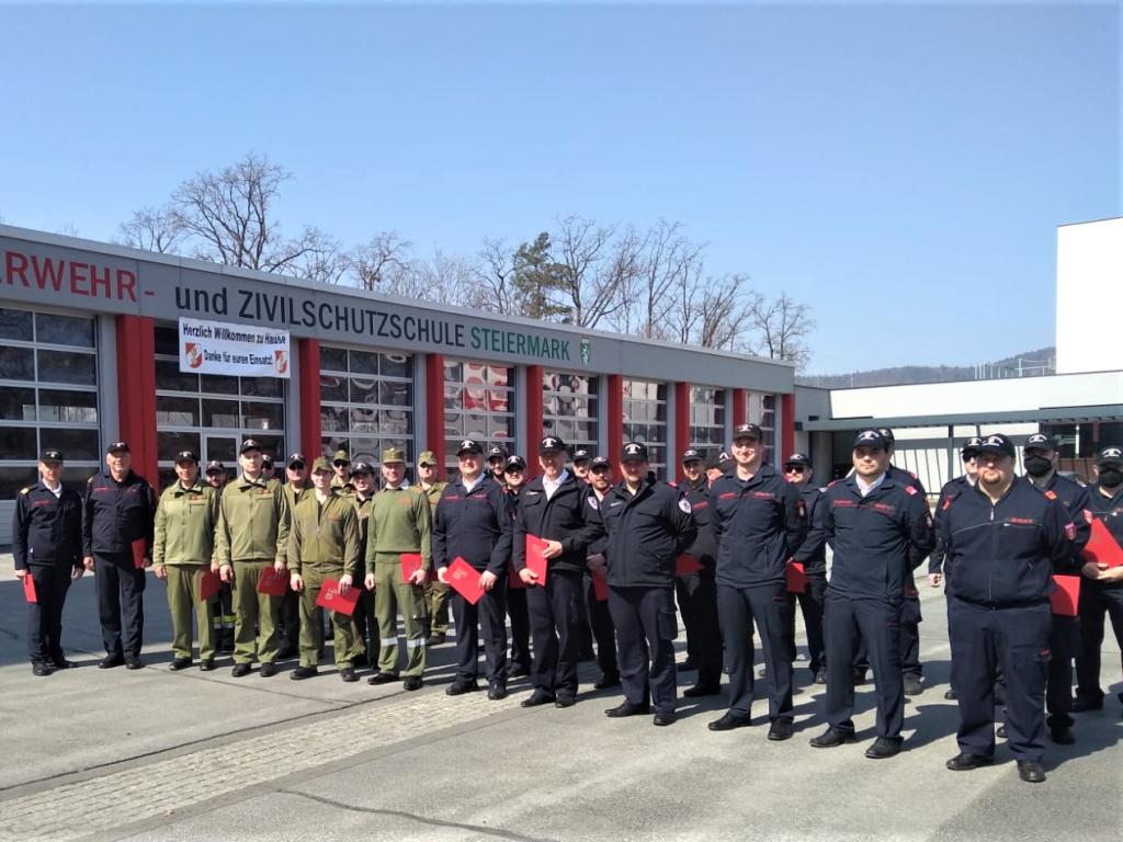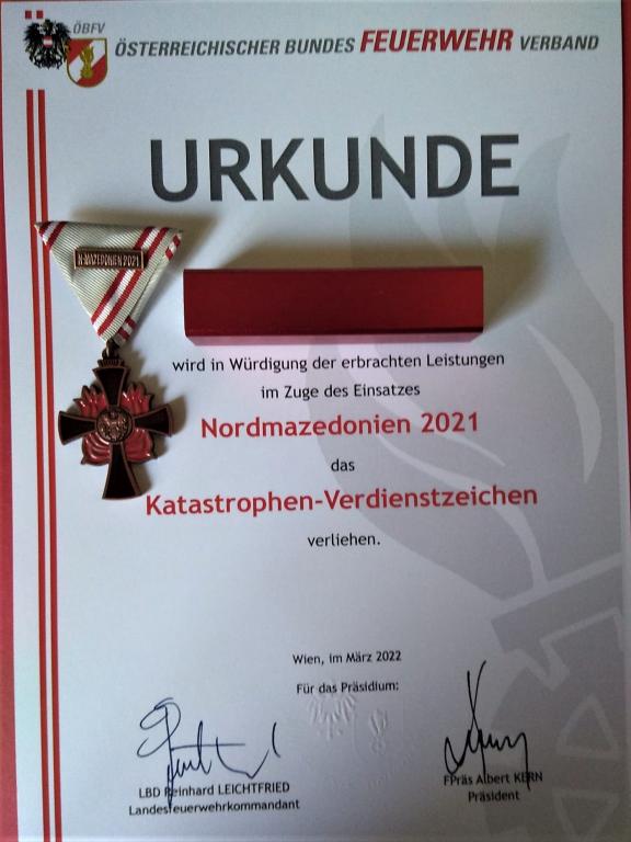 Neun Kameraden der FF Voitsberg, welche im Vorjahr mit weiteren Kameraden des Bereichsfeuerwehrverbandes Voitsberg, des LFV Steiermark und des LFV Niederösterreich in Nordmazedonien im Waldbrand-Einsatz standen, wurden am Samstag, 26. März 2022 an der Feuerwehr-und Zivilschutzschule Steiermark in Lebring von LBD Reinhard Leichtfried, Landesrat Johann Seitinger und der Abgeordneten zum Landtag Mag.a Bernadette Kerschler mit dem Katastrophen-Verdienstzeichen des österreichischen Bundesfeuerwehrverbandes (ÖBFV) ausgezeichnet.