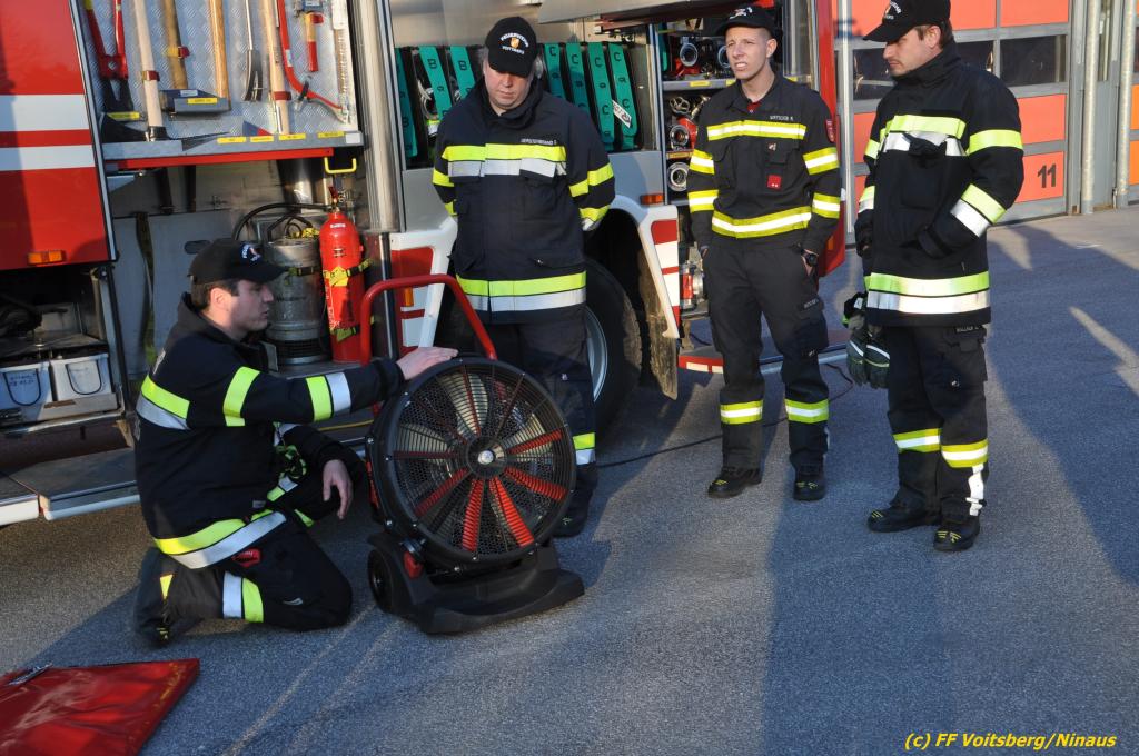 VOITSBERG, am 04.04.2022 Beim Feuerwehrhaus fand am Montag, 4.4.2022 eine technische Übung statt. Neben der Gerätekunde wurden noch mit C42 Schläuchen, dem Hochstrahlrohr, dem Rauchvorhang und der 3teiligen Schiebeleiter geübt.
