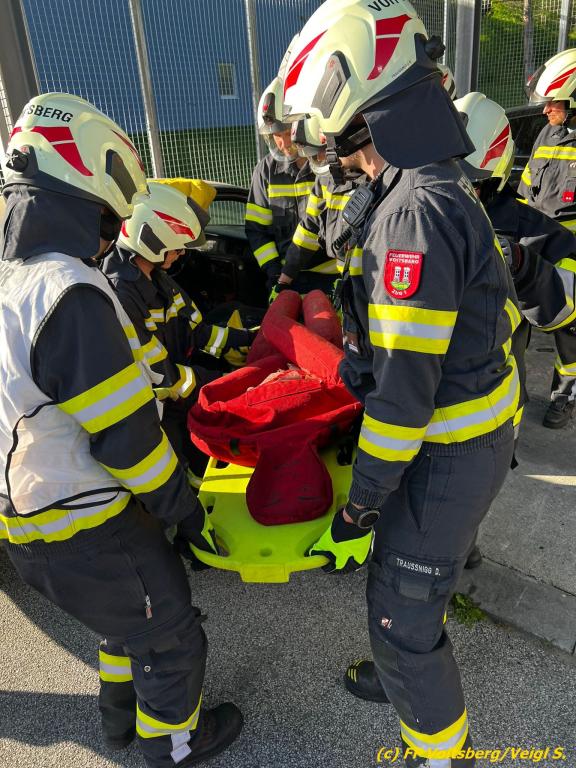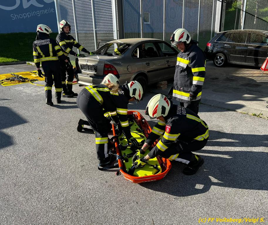Anschließend ordnete der Übungseinsatzleiter LM d.F. Christian Rozic eine schonende Rettung der verunfallten Personen an. Der Lenker wurde mit Hilfe des Spineboards über den Kofferraum gerettet. Zur Befreiung des Beifahrers mussten beide Fahrzeugtüren und die B-Säule mittels hydraulischem Rettungsgerät entfernt werden. Die Verletzten wurden anschließend von Feuerwehrsanitätern versorgt.