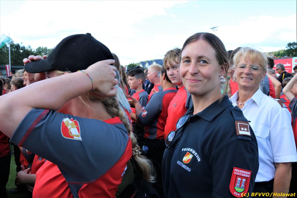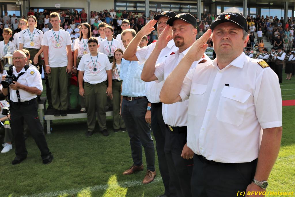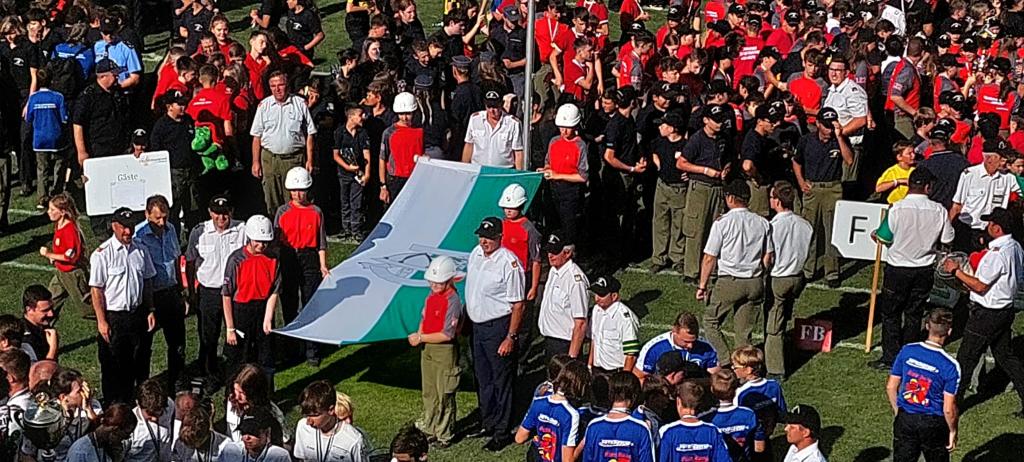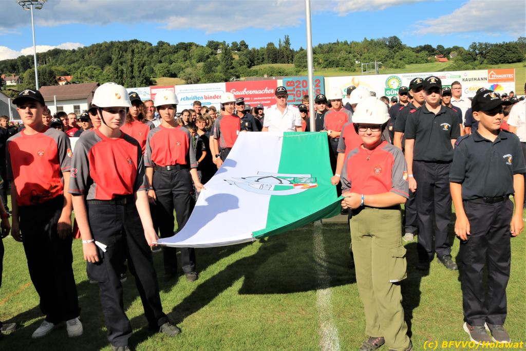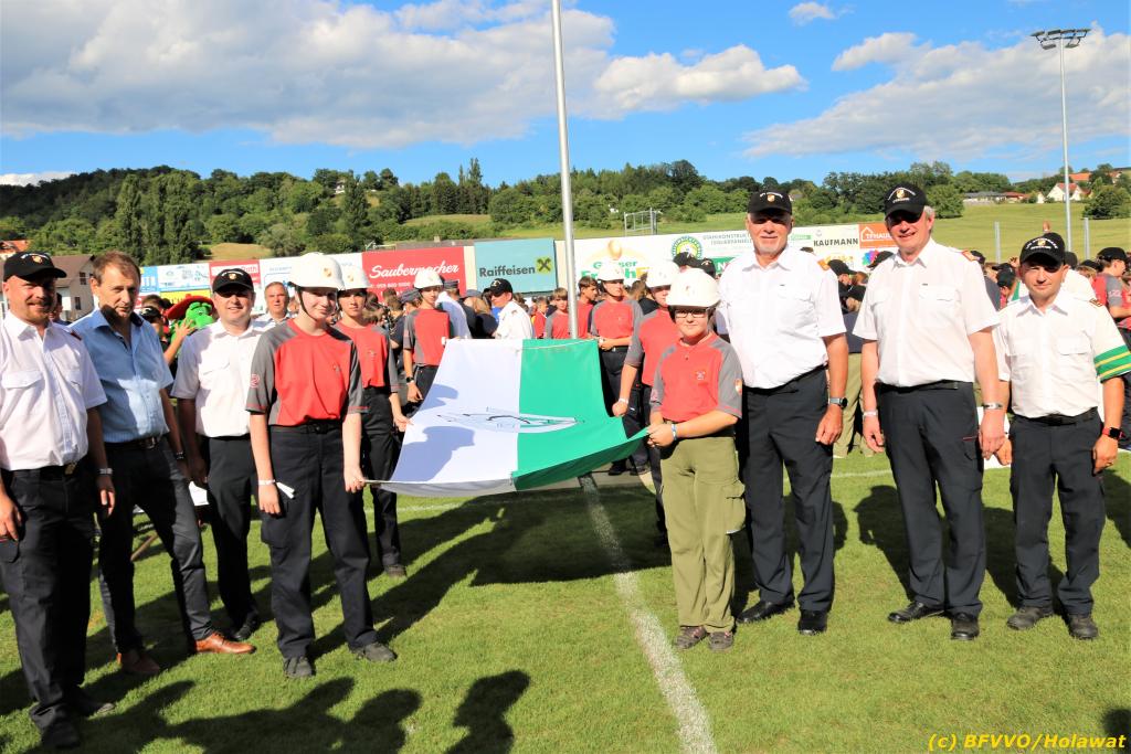 Am Ende des Landesjugendleistungsbewerbes in Gnas fand die offizielle Übergabe der Bewerbsfahne von der FF Gnas an die FF Voitsberg, Veranstalter des nächsten Jugendbewerbes 2023, statt.