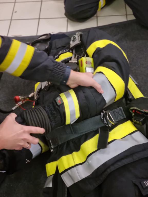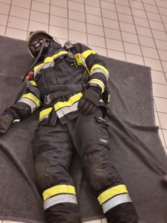 Station 3: Annahme war, dass ein Atemschutzgeräteträger plötzlich bewusstlos wurde. Ziel war es, dem bewusstlosen Kameraden schnellstmöglich die Uniform und das Atemschutzgerät abzunehmen.