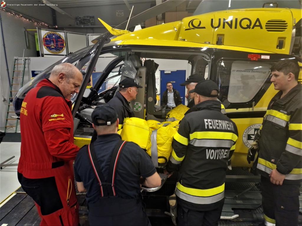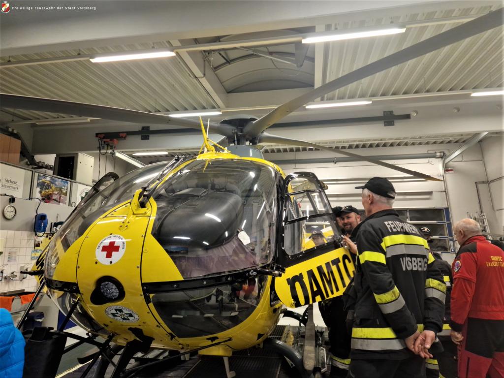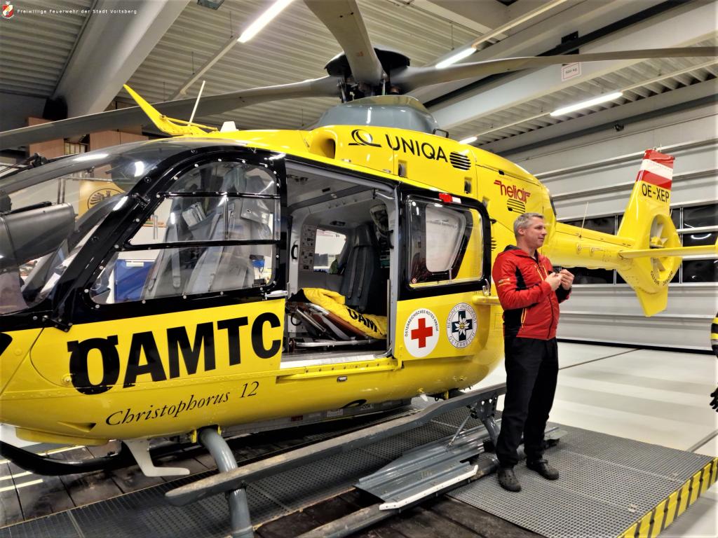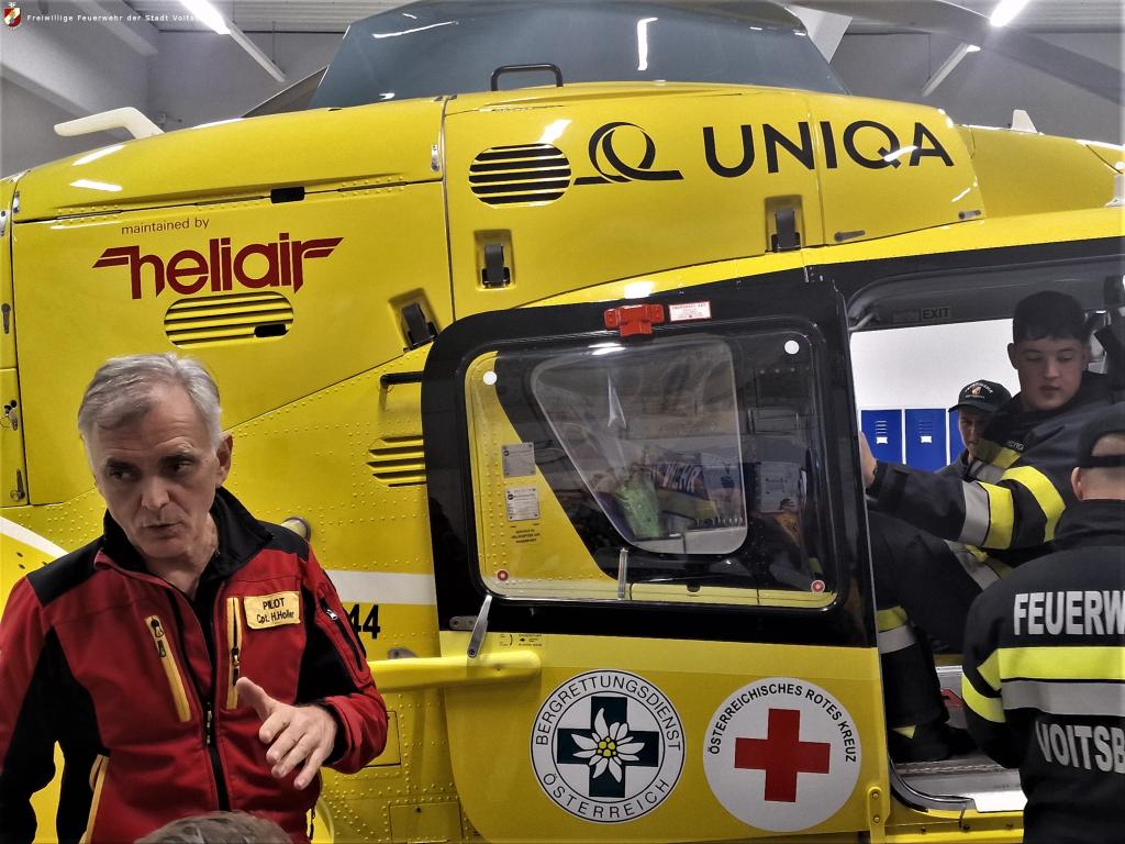 Die diensthabende Crew (Pilot Captain H. Holler, Notarzt Dr. G. Gemes, Flugretter T. Leitinger) erläuterten mit den interessierten Feuerwehrmännern / allgemeine Sicherheitshinweise (Sicherheitsabstände, Annäherung, ...) / Möglichkeiten zur Brandbekämpfung / Personenrettung im Falle einer Havarie (Crew und Patient) / Umgang mit Notöffnungen / Unterstützung in der Be- und Entladung von Patienten / Einweisung zur Landung / Anforderungen an Landeplätze