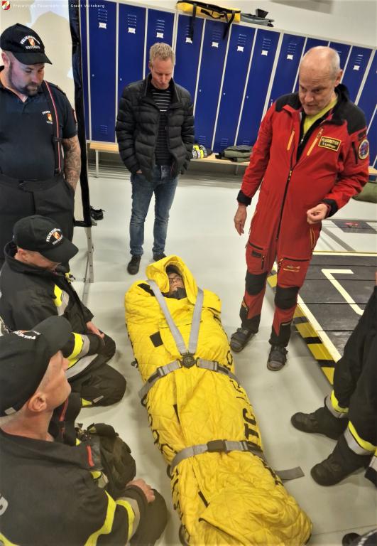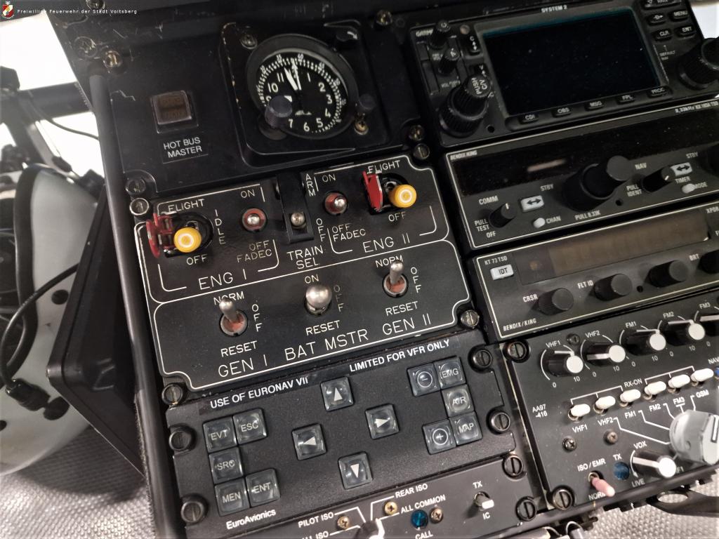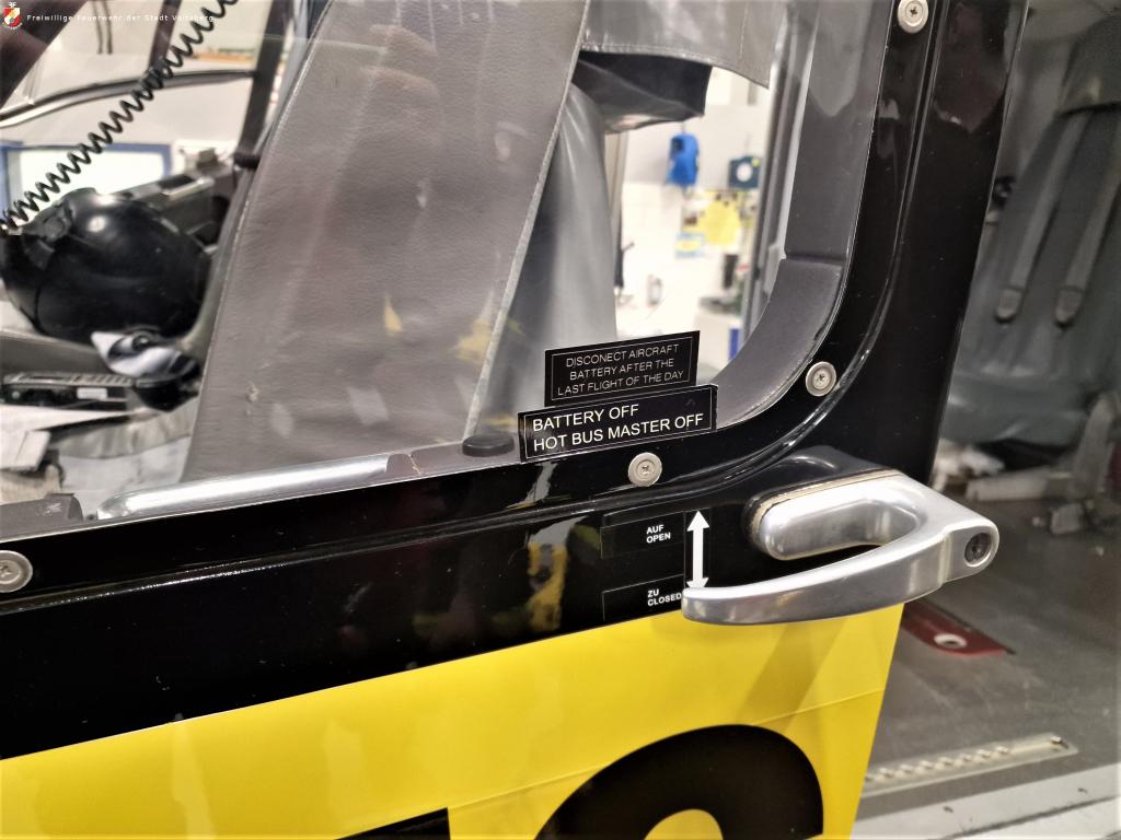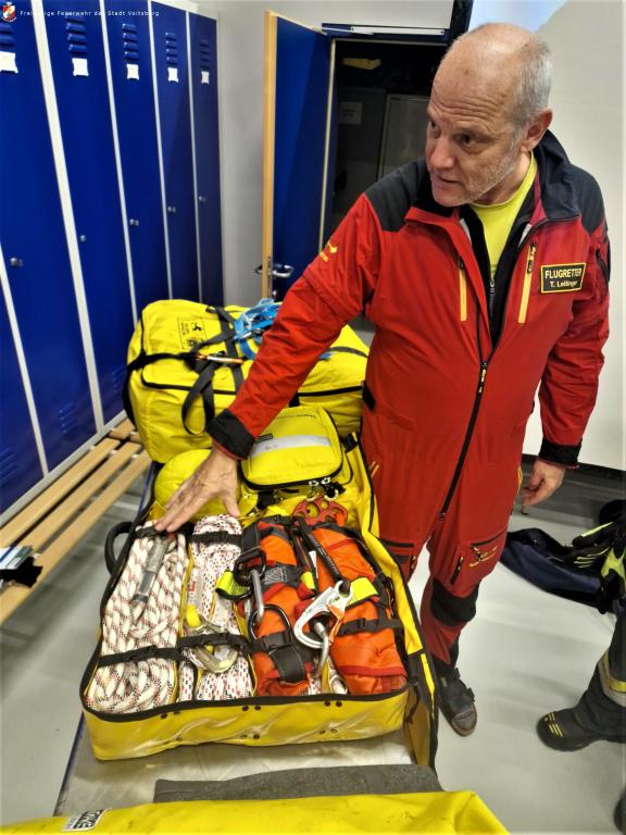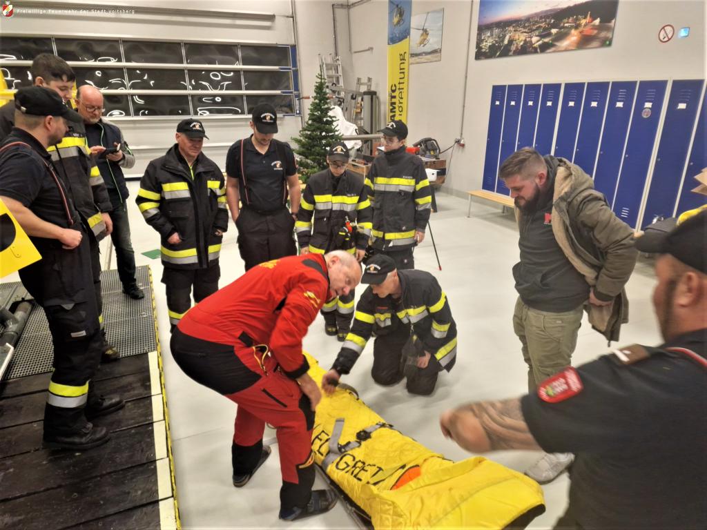 Die diensthabende Crew (Pilot Captain H. Holler, Notarzt Dr. G. Gemes, Flugretter T. Leitinger) erläuterten mit den interessierten Feuerwehrmännern / allgemeine Sicherheitshinweise (Sicherheitsabstände, Annäherung, ...) / Möglichkeiten zur Brandbekämpfung / Personenrettung im Falle einer Havarie (Crew und Patient) / Umgang mit Notöffnungen / Unterstützung in der Be- und Entladung von Patienten / Einweisung zur Landung / Anforderungen an Landeplätze