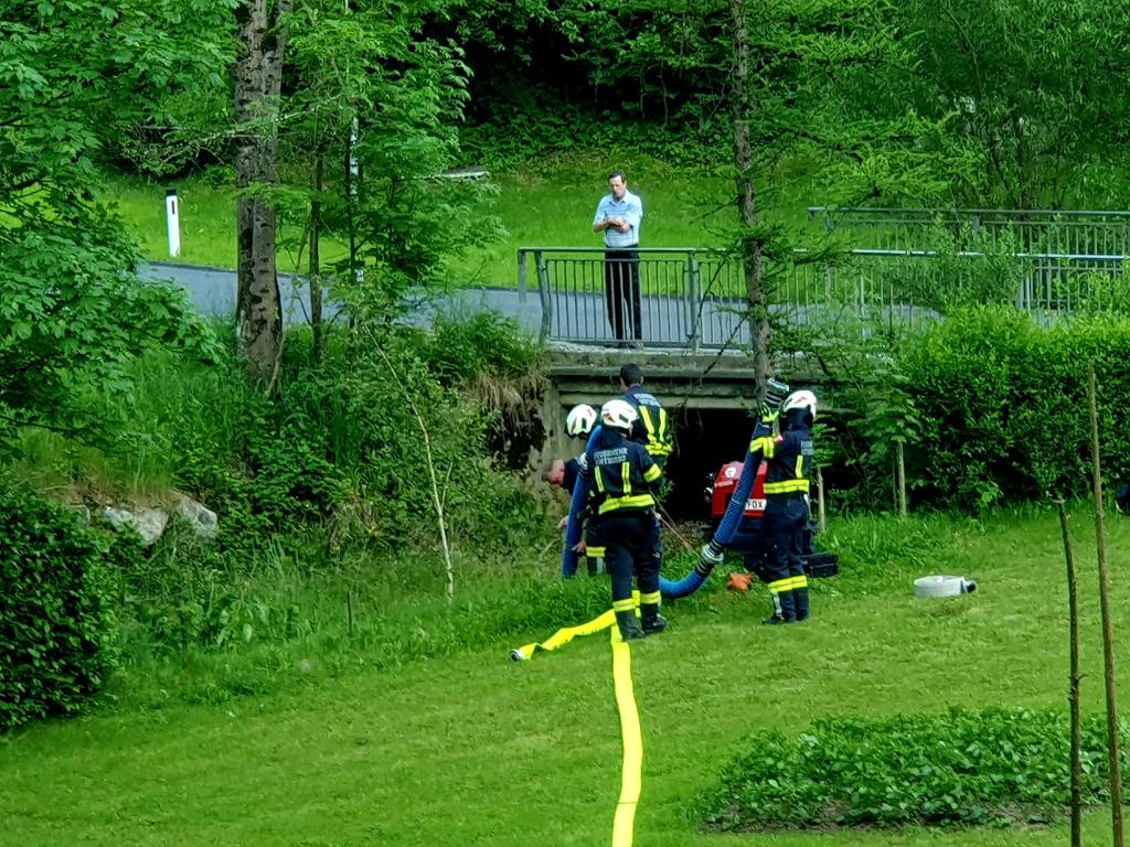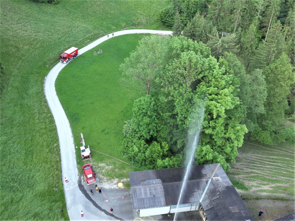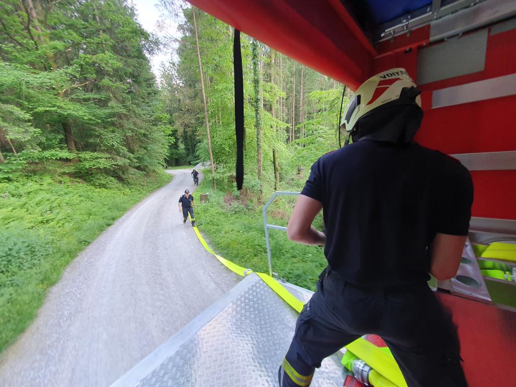 Während die Besatzung des HLF 4 einen Löschangriff mit 2 C-Rohren durchführte, wurde mit dem erst vor einigen Monaten neu angeschafften WLF 2 mit WLA-Schlauch die Zubringleitung verlegt. Hier konnten in knapp 6 Minuten 560 Meter und rund 60 Höhenmeter überwunden werden.