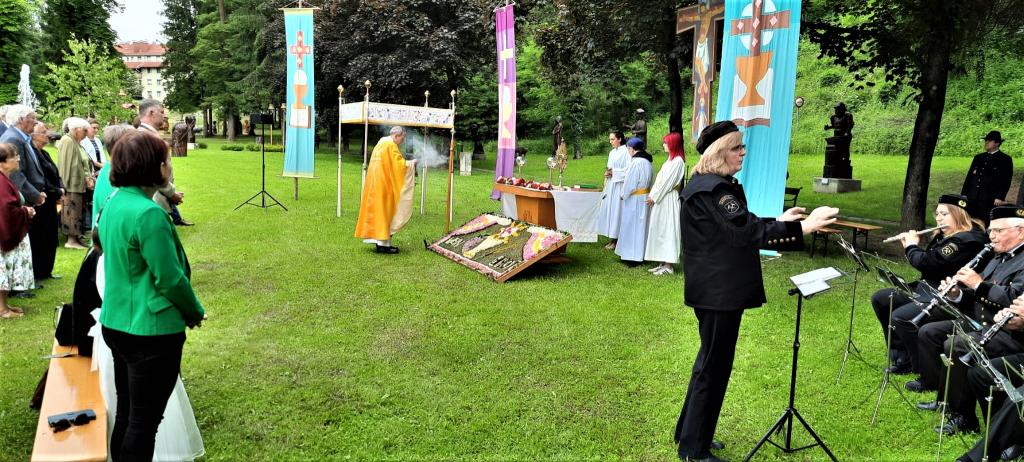 Nach der von Pfarrer Mag. Gerald Krempl abgehaltenen Messe im Schlosspark Greißenegg marschierten alle Teilnehmer unter Vorantritt der Bergkapelle Hödlgrube-Zangtal in einer Prozession zum Voitsberger Hauptplatz.