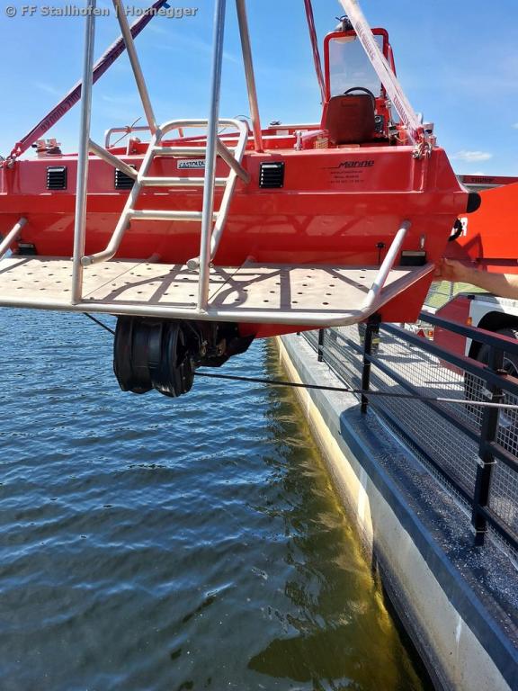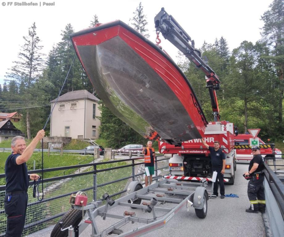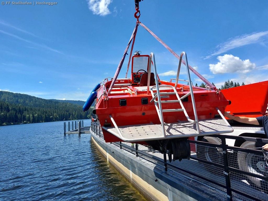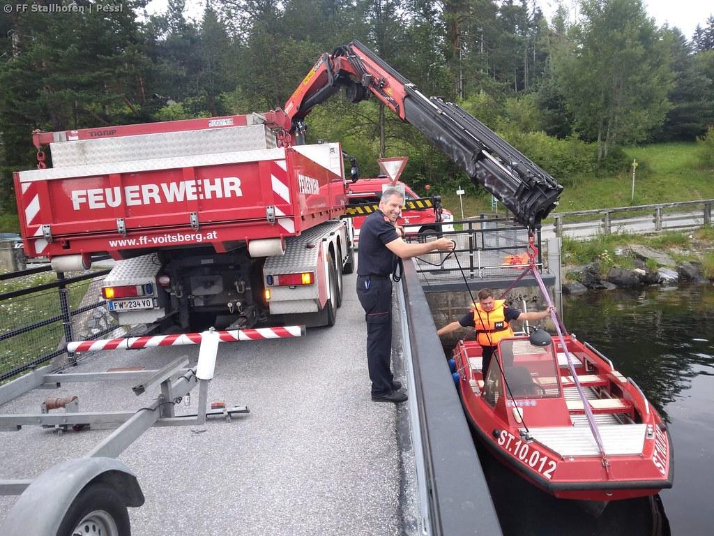 Nachdem bei einer der letzten Übungen festgestellt werden musste, dass das Slippen bei der Slipanlage immer schwieriger wird, wurde im Zuge dieser Übung ein geeigneter Platz gesucht, um das Einsatzboot mit dem Kran des WLF Voitsberg in den Stausee zu heben.