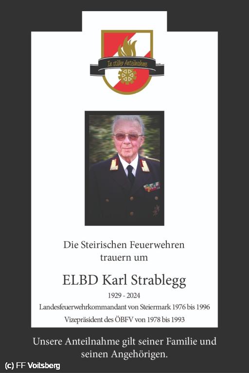 VOITSBERG, am 28.05.2024 Die FF Voitsberg trauert um ihr langjähriges Mitglied Karl Strablegg. Er trat im Jahre 1949 der Stadtfeuerwehr bei. Seine Feuerwehrlaufbahn führte ihn über dem Kommandanten der FF Voitsberg, dem Bezirksfeuerwehrkommandanten des Bezirkes Voitsberg, des Landesbranddirektors der Steiermark hin bis zum Vizepräsidenten des Bundesfeuerwehrverbandes.